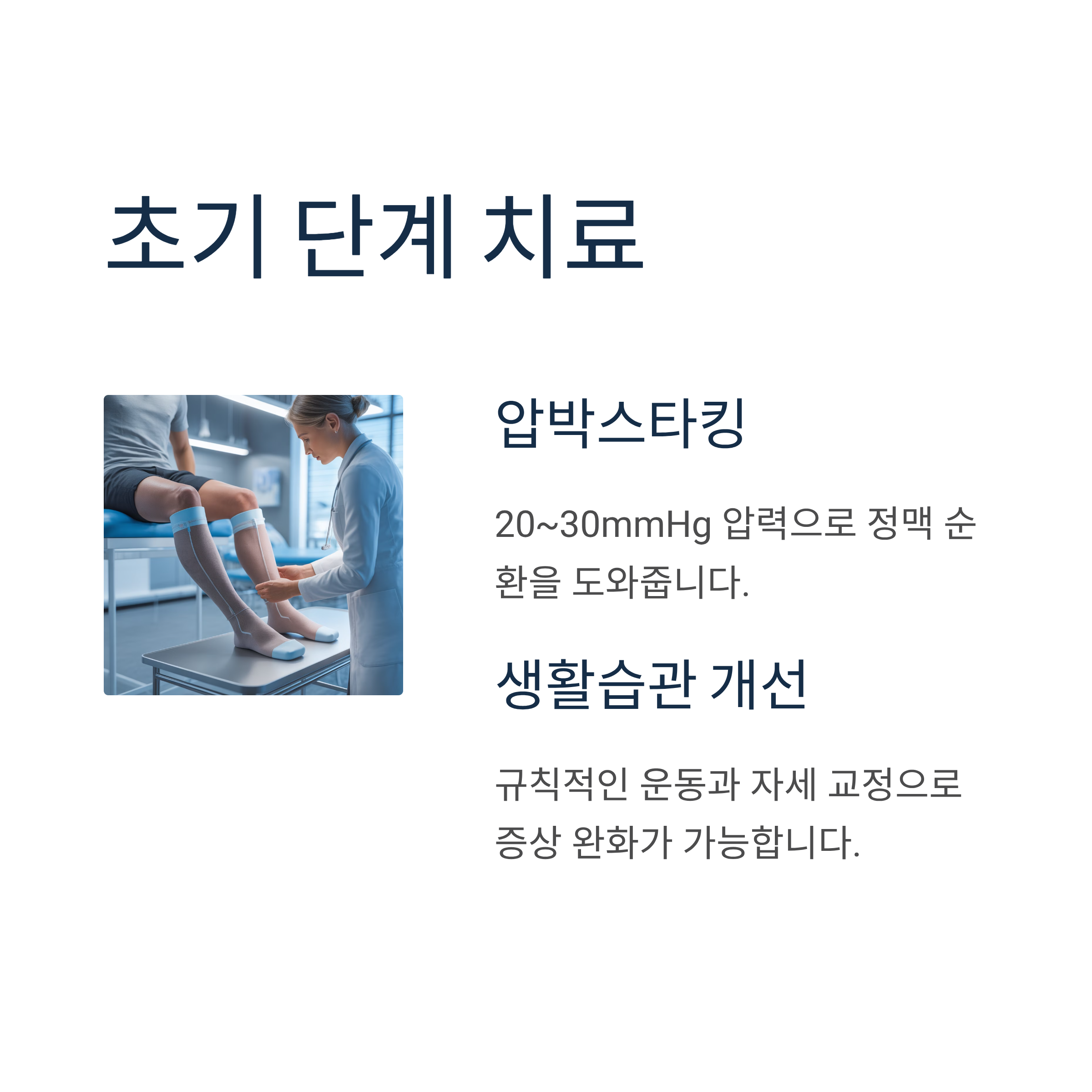 초기 단계에서는 의료용 압박스타킹 착용과 생활습관 개선으로 증상을 완화할 수 있습니다. 압박스타킹은 20~30mmHg 압력으로 정맥 순환을 도와줍니다.