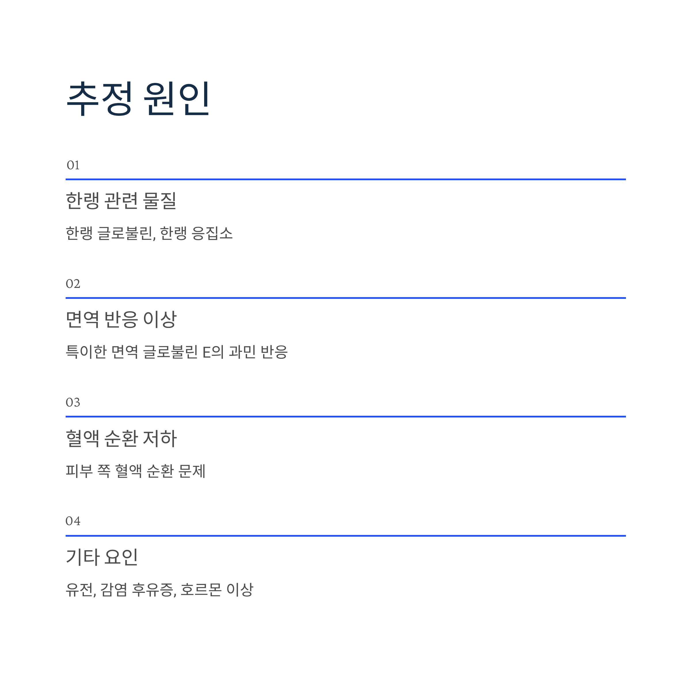 한랭 두드러기의 정확한 원인은 아직 명확히 밝혀지지 않았습니다. 다만 다음과 같은 요인이 복합적으로 작용하는 것으로 추측됩니다.