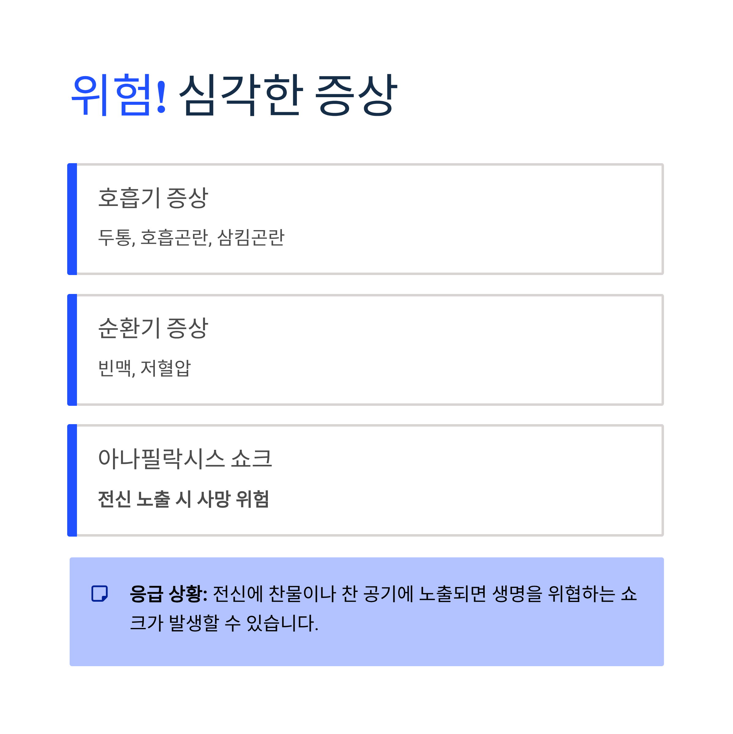 - 전신 노출 시 아나필락시스 쇼크 (사망 위험)