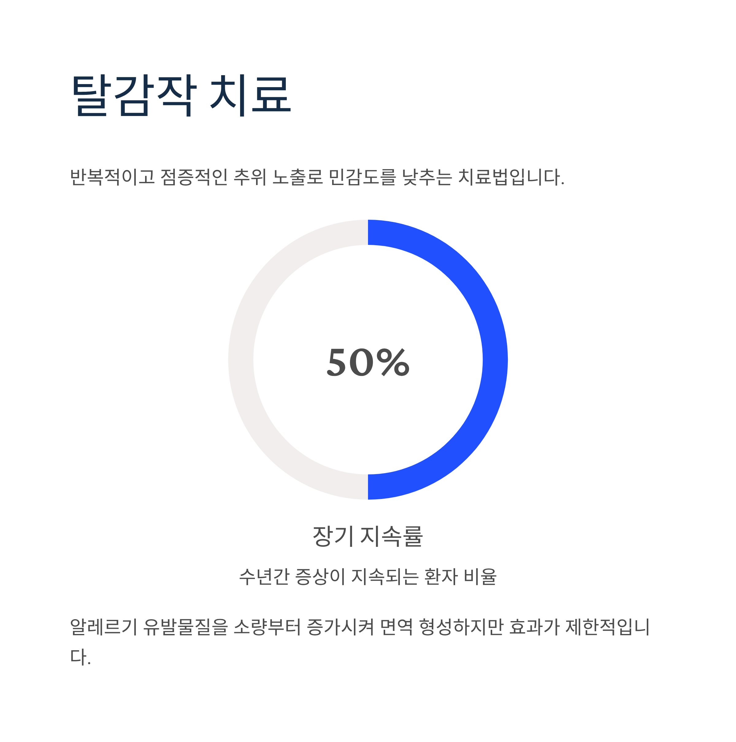 반복적이고 점증적인 추위 노출을 통해 추위 민감도를 낮추는 치료입니다. 알레르기 유발물질을 소량부터 점차 증가시켜 면역을 형성하는 방법이지만, 약 50%는 수년간 증상이 지속되어 효과가 제한적입니다.