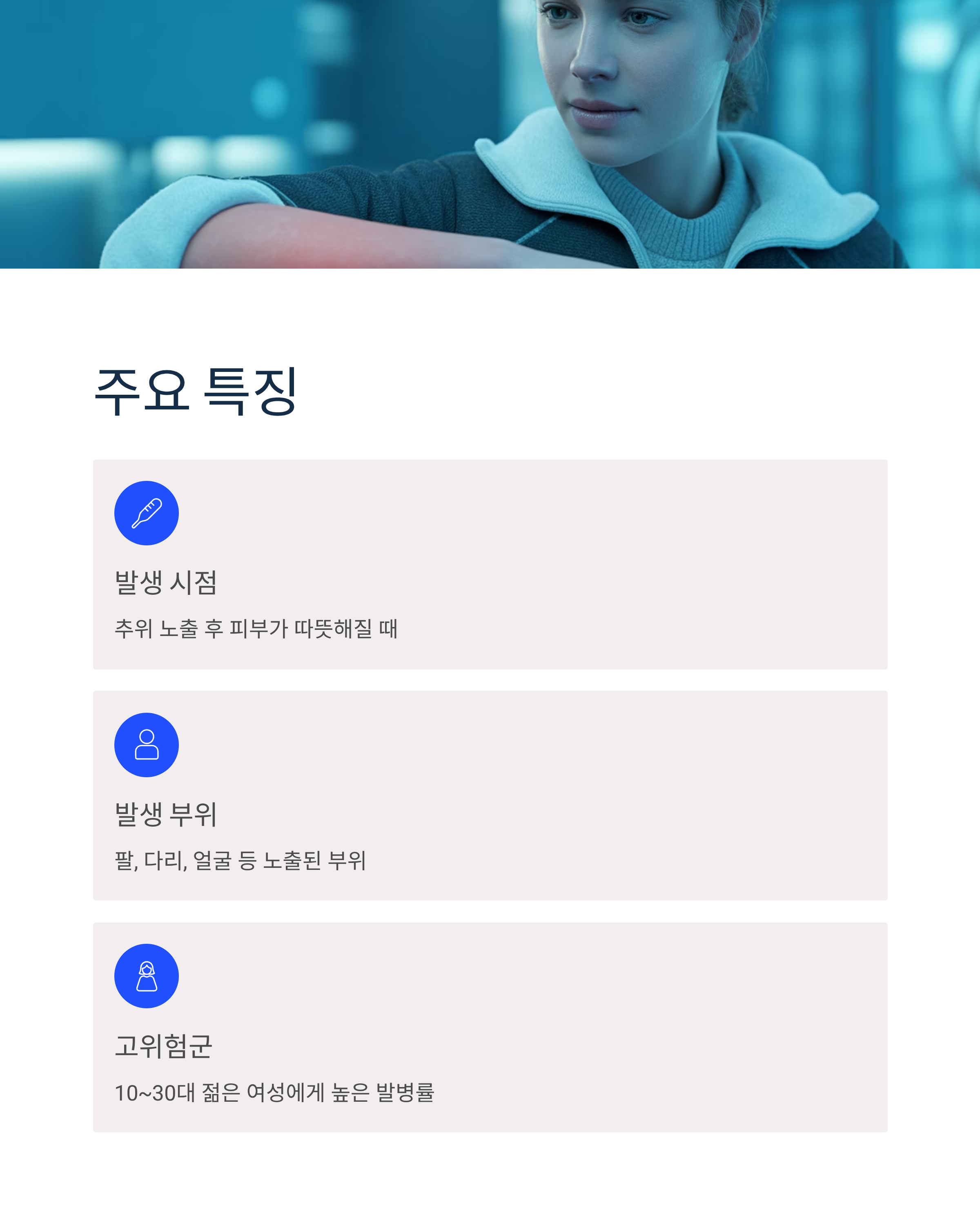 - 추위에 노출된 후 피부가 다시 따뜻해질 때 증상 발생