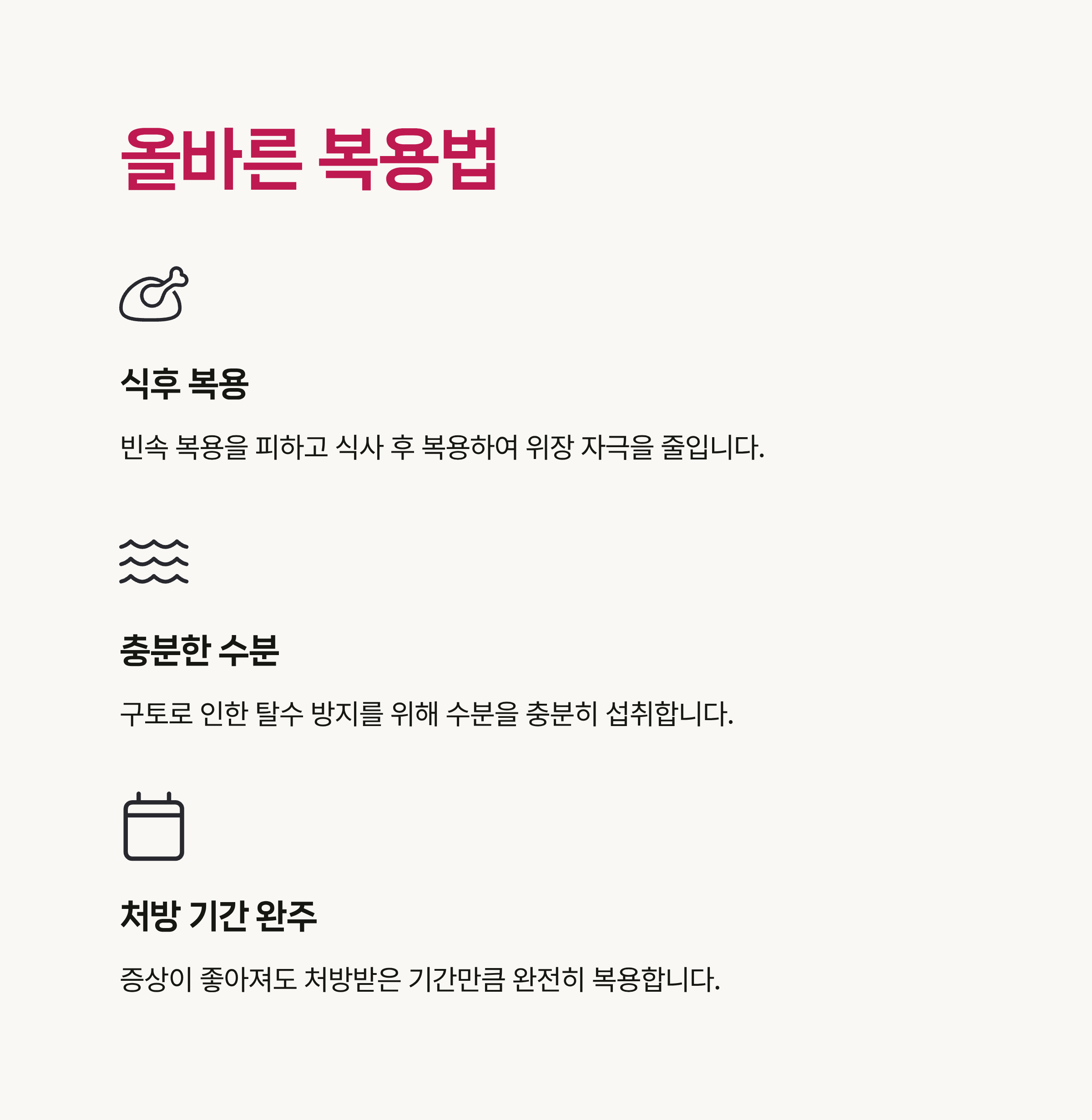- 처방 기간 완주: 증상이 좋아져도 처방받은 기간만큼 완전히 복용해야 합니다.