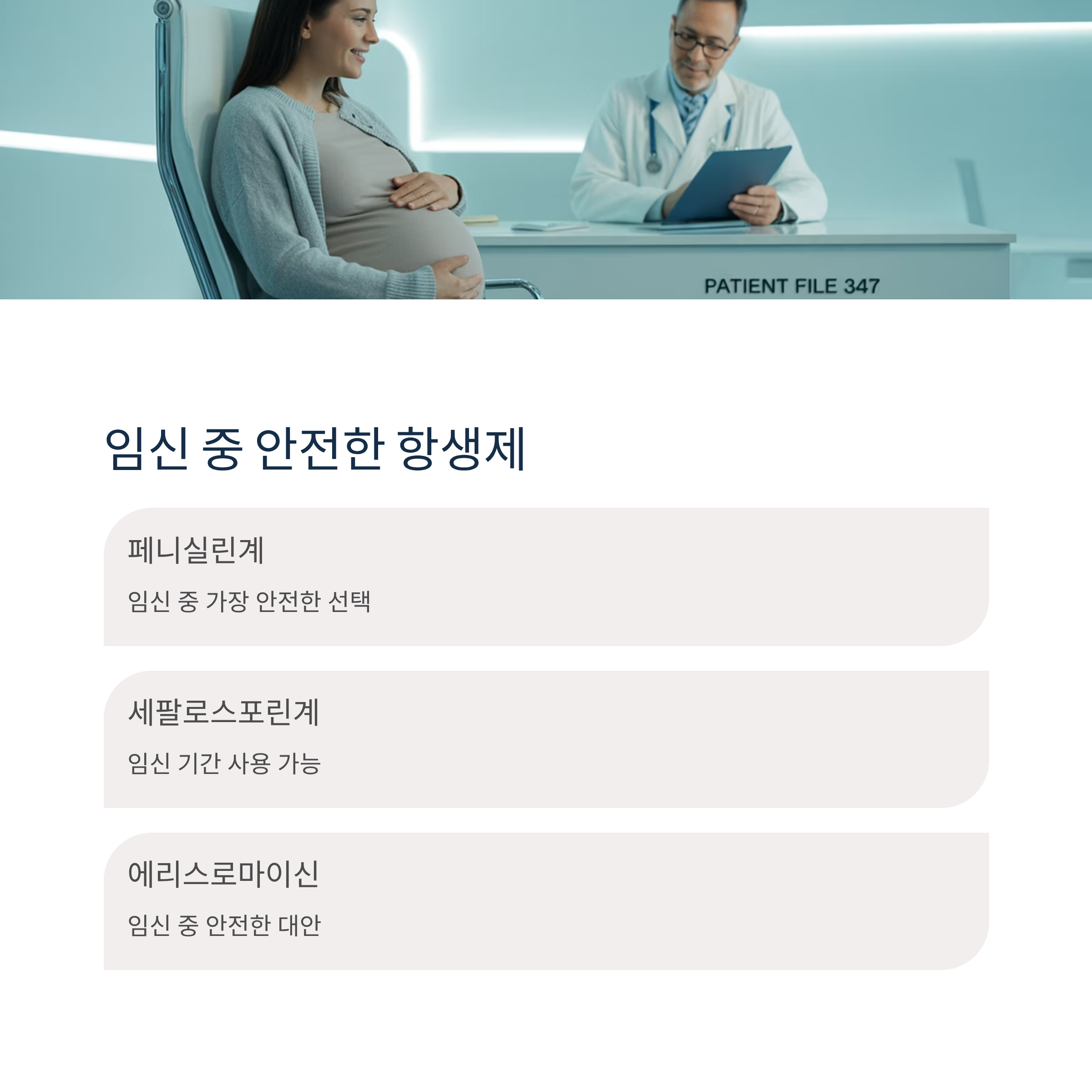 페니실린, 세팔로스포린계, 에리스로마이신은 임신 기간 동안 사용하기에 가장 안전한 항생제입니다. 에리스로마이신은 임신 기간 동안 사용하기에 가장 안전한 항생제 중 하나로 간주됩니다.