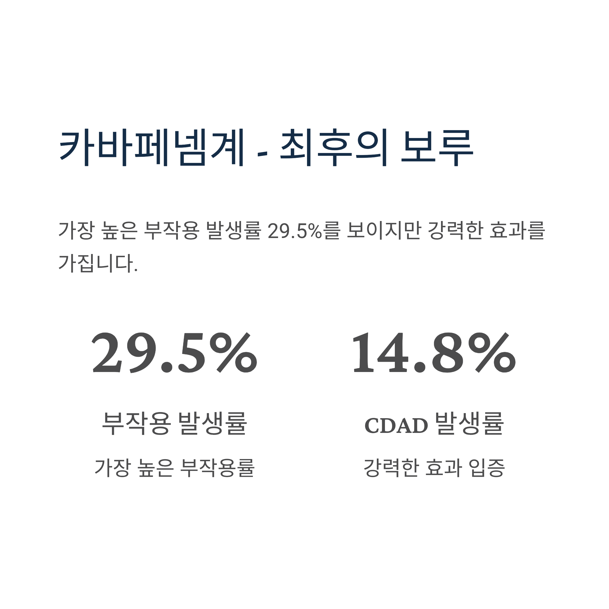 카바페넴계는 가장 높은 부작용 발생률 29.5%를 보이지만 CDAD 발생률은 14.8%로 강력한 효과를 보입니다.