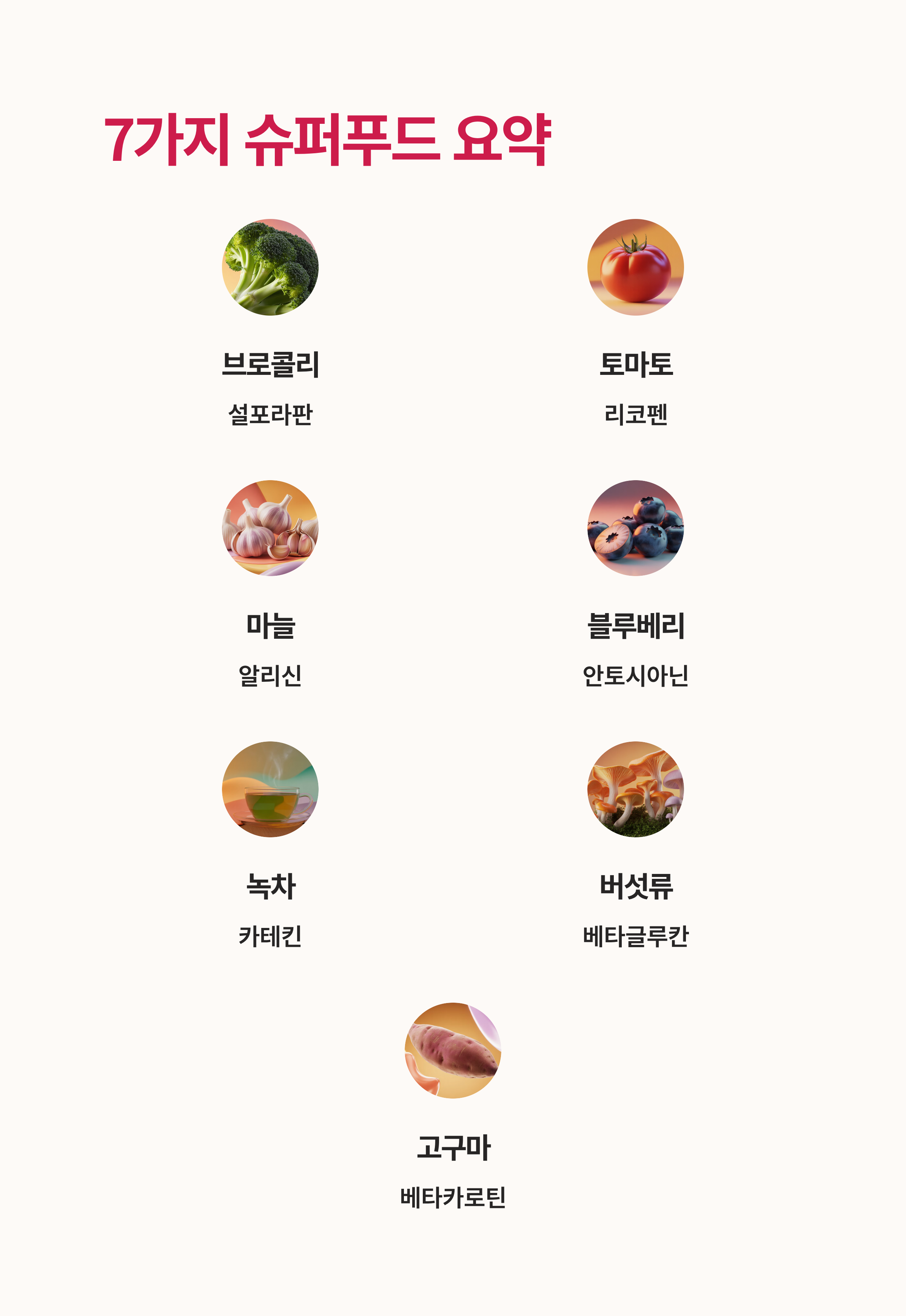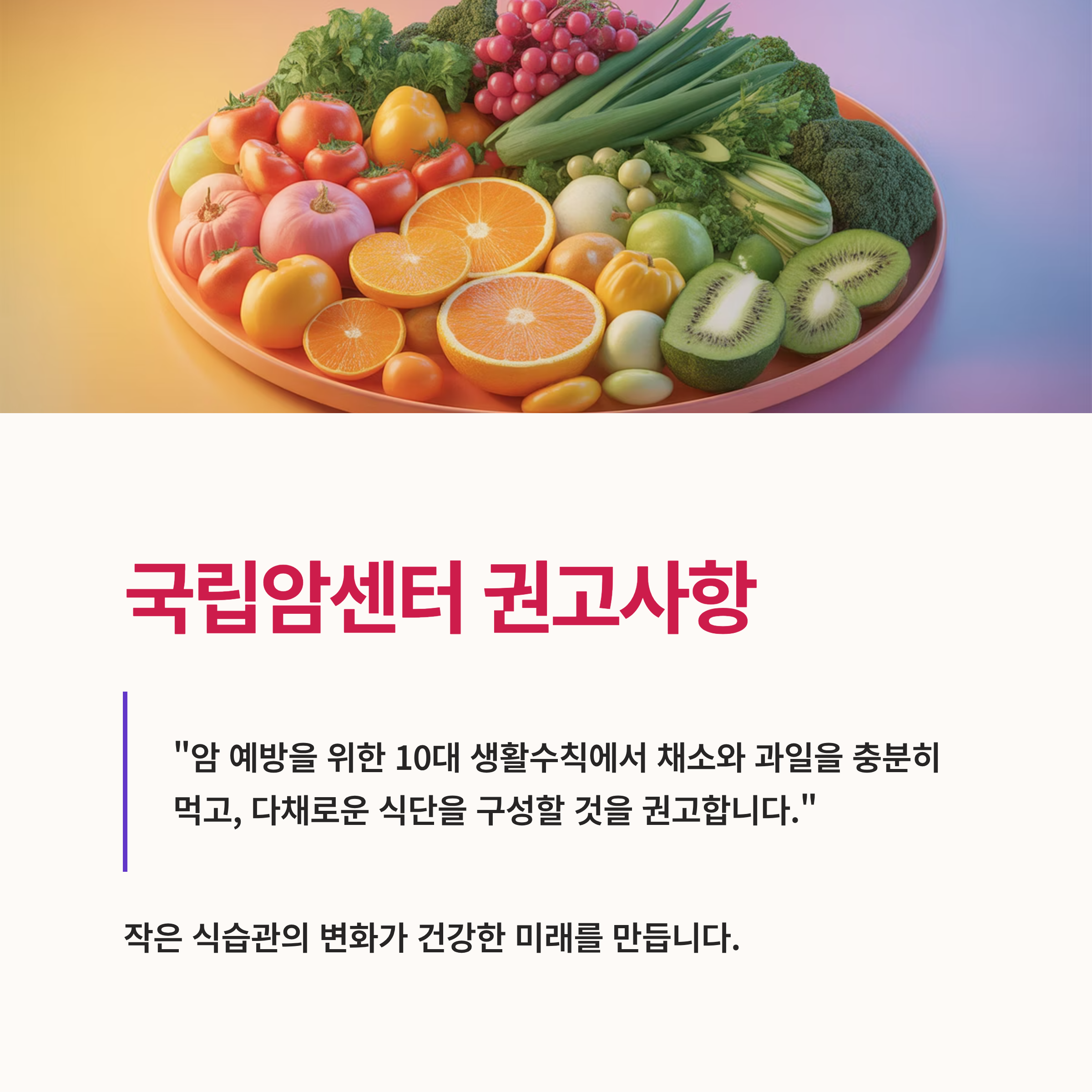 국립암센터는 "암 예방을 위한 10대 생활수칙"에서 채소와 과일을 충분히 먹고, 다채로운 식단을 구성할 것을 권고합니다. 오늘부터 소개해드린 7가지 슈퍼푸드를 식탁에 자주 올려보세요. 작은 식습관의 변화가 건강한 미래를 만듭니다.