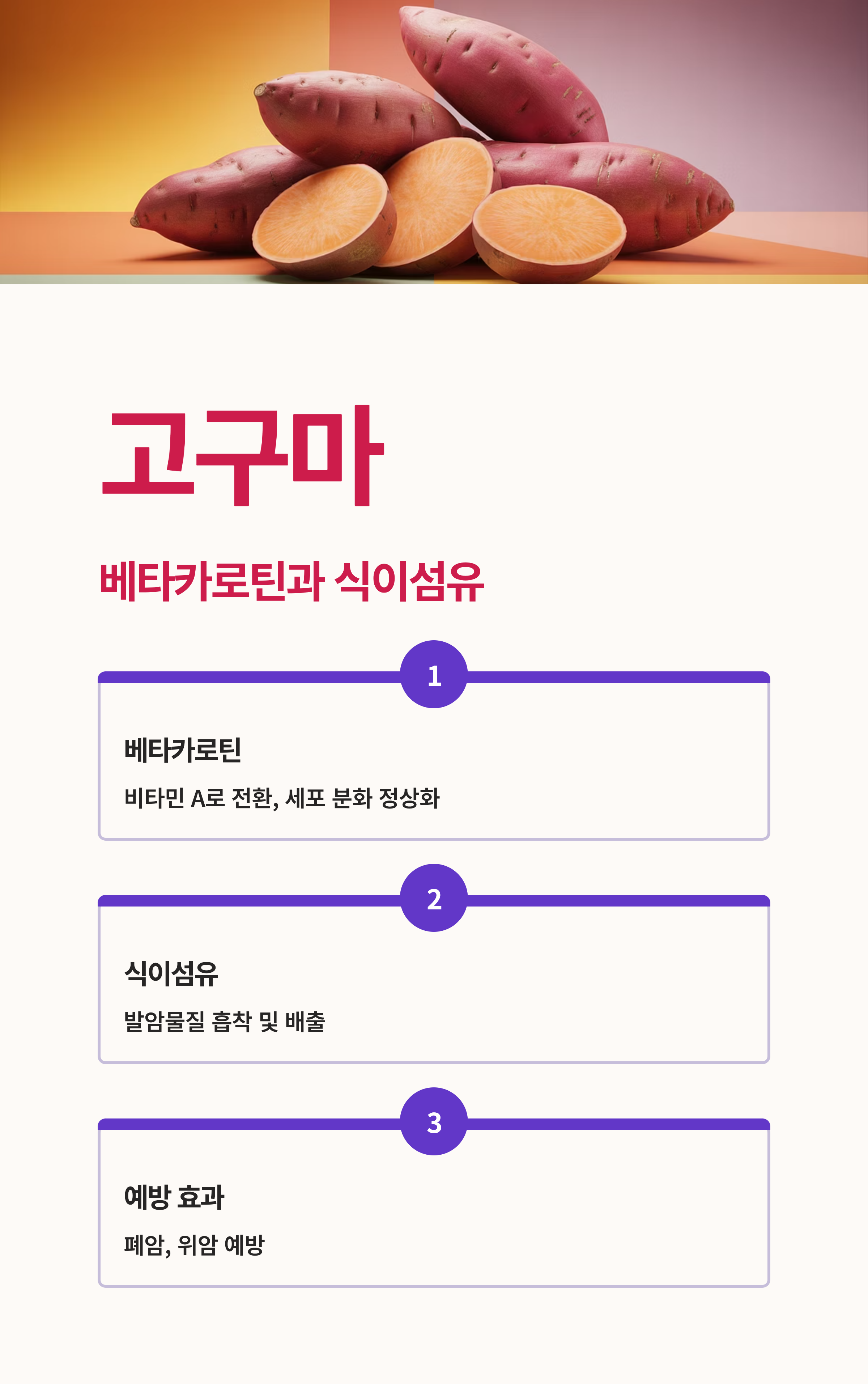 고구마의 베타카로틴은 체내에서 비타민 A로 전환되어 세포 분화를 정상화하고 폐암, 위암 예방에 도움을 줍니다. 또한 풍부한 식이섬유는 발암물질을 흡착해 배출시킵니다. 하루 중간 크기 1개(150~200g)가 적당하며, 껍질째 찌거나 구워 먹으면 영양소 손실이 적습니다.