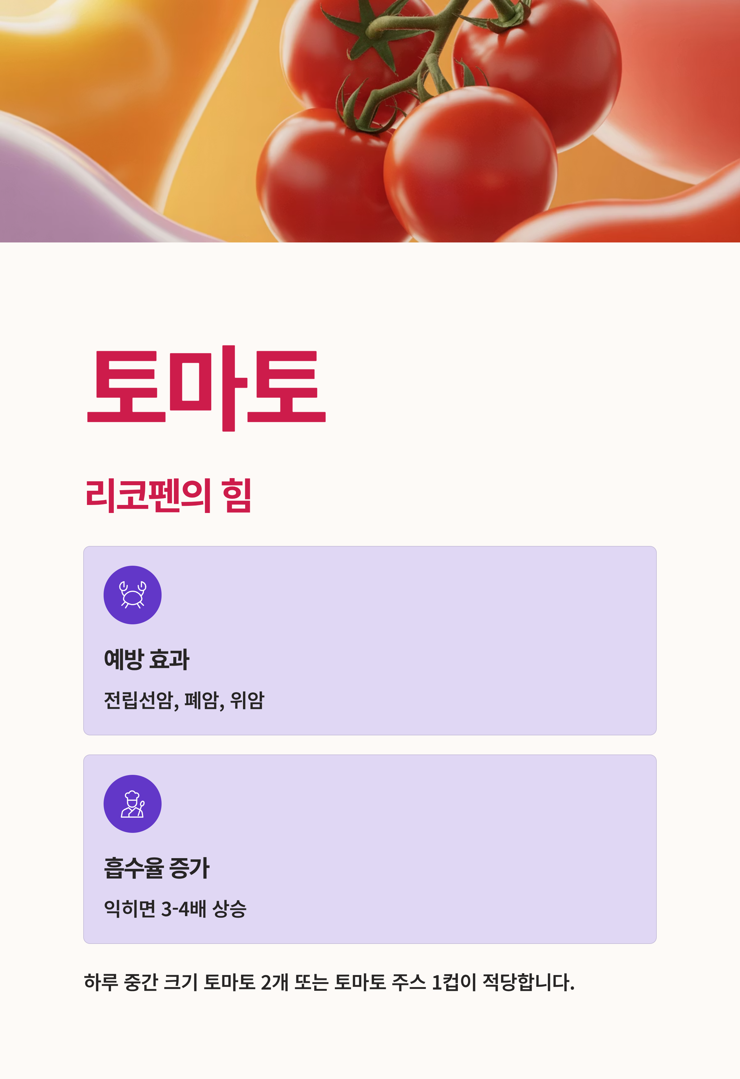 토마토의 붉은 색소인 리코펜은 강력한 항산화 물질로 전립선암, 폐암, 위암 예방에 탁월합니다. 흥미로운 점은 익혀 먹을 때 리코펜 흡수율이 3~4배 증가한다는 것입니다. 하루 중간 크기 토마토 2개 또는 토마토 주스 1컵이 적당합니다.