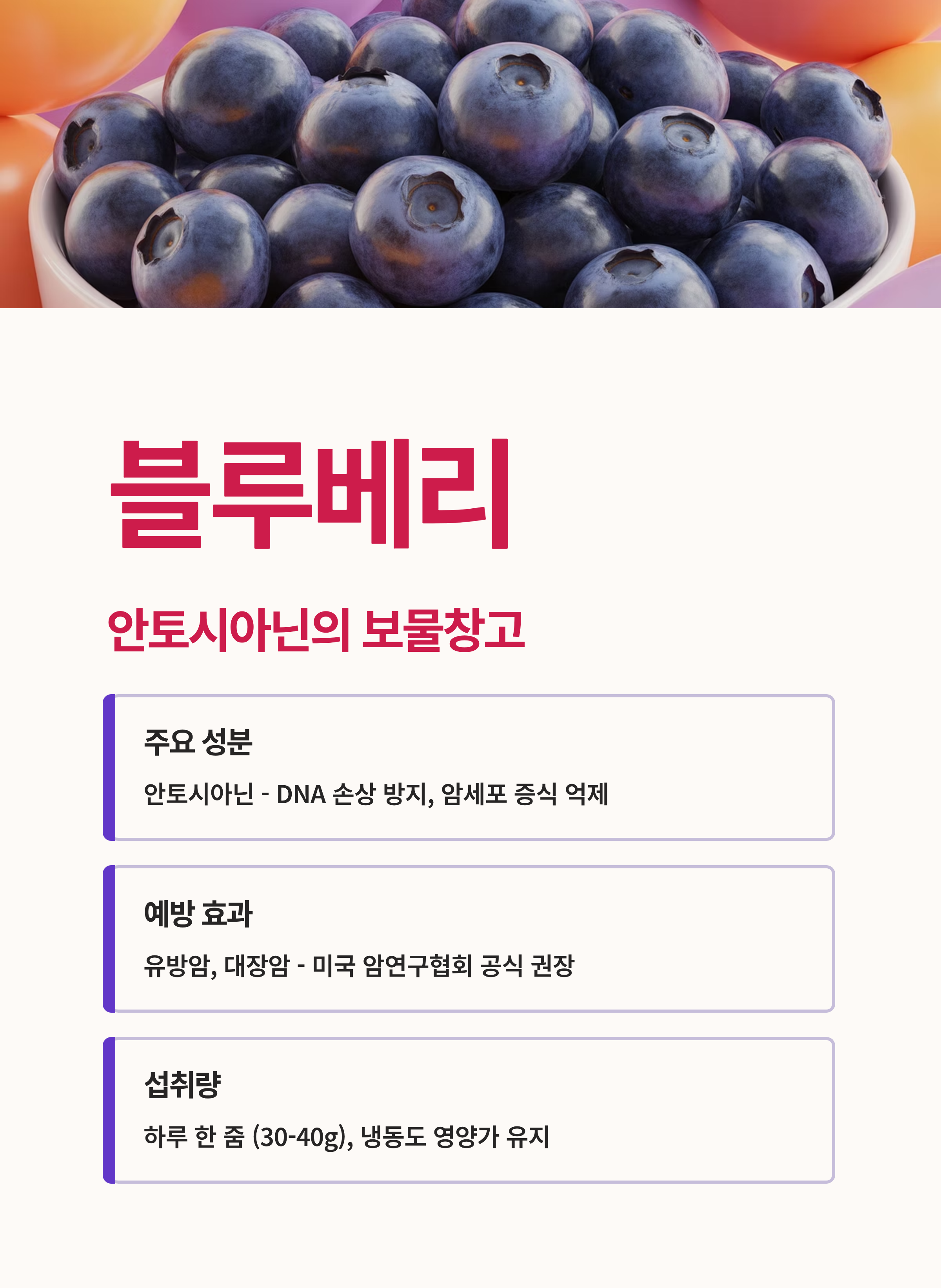 블루베리의 보라색 색소 안토시아닌은 DNA 손상을 막고 암세포 증식을 억제합니다. 특히 유방암, 대장암 예방에 효과적이며, 미국 암연구협회(AICR)가 공식 권장하는 항암식품입니다. 하루 한 줌(30~40g)이면 충분하며, 냉동 블루베리도 영양가가 유지됩니다.