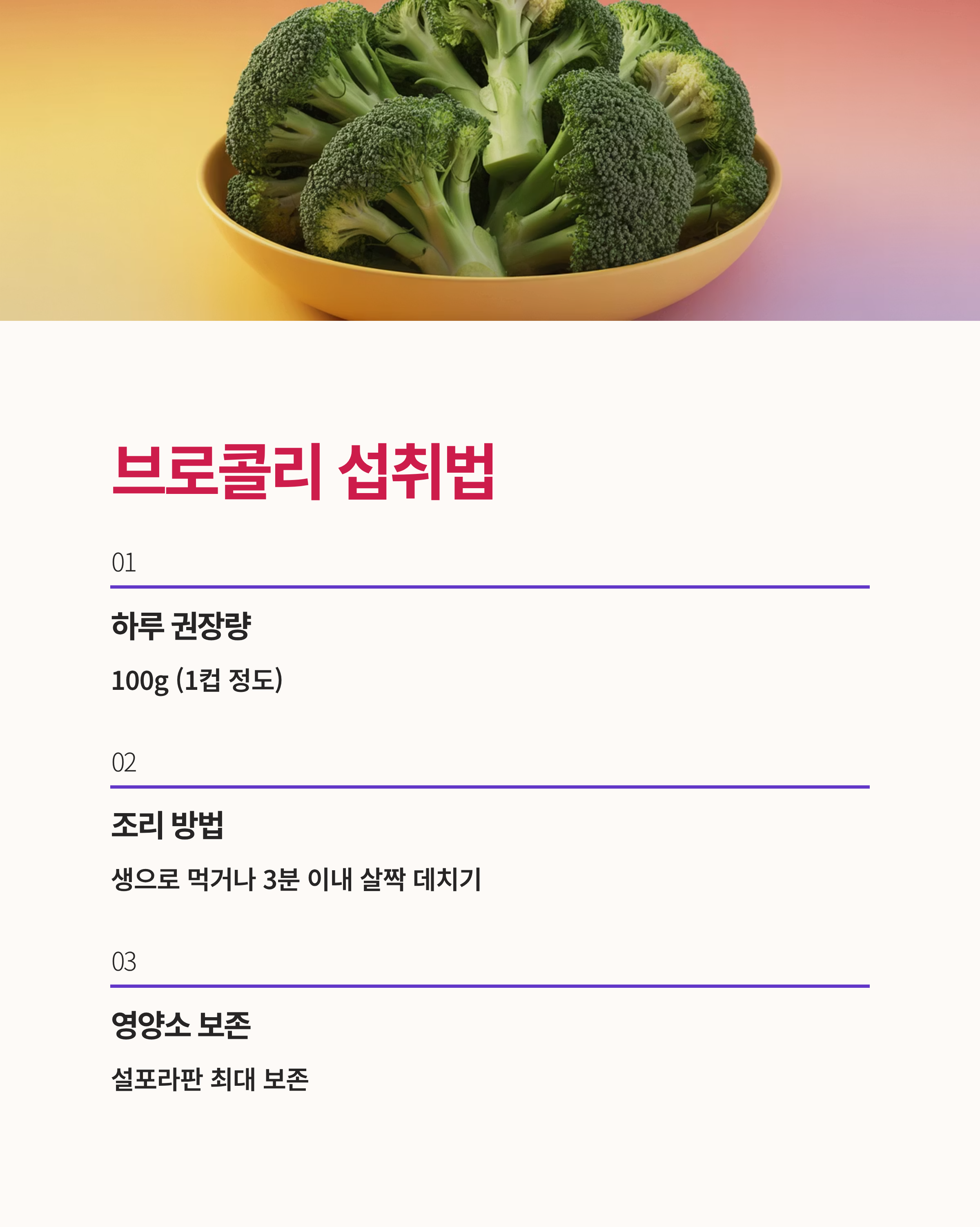 브로콜리에 함유된 설포라판은 암세포의 자살(아포토시스)을 유도하고 발암물질 해독 효소를 활성화합니다. 특히 위암, 대장암, 전립선암 예방에 효과적입니다. 하루 권장량은 100g(1컵 정도)이며, 생으로 먹거나 3분 이내로 살짝 데쳐 먹는 것이 설포라판 보존에 좋습니다.