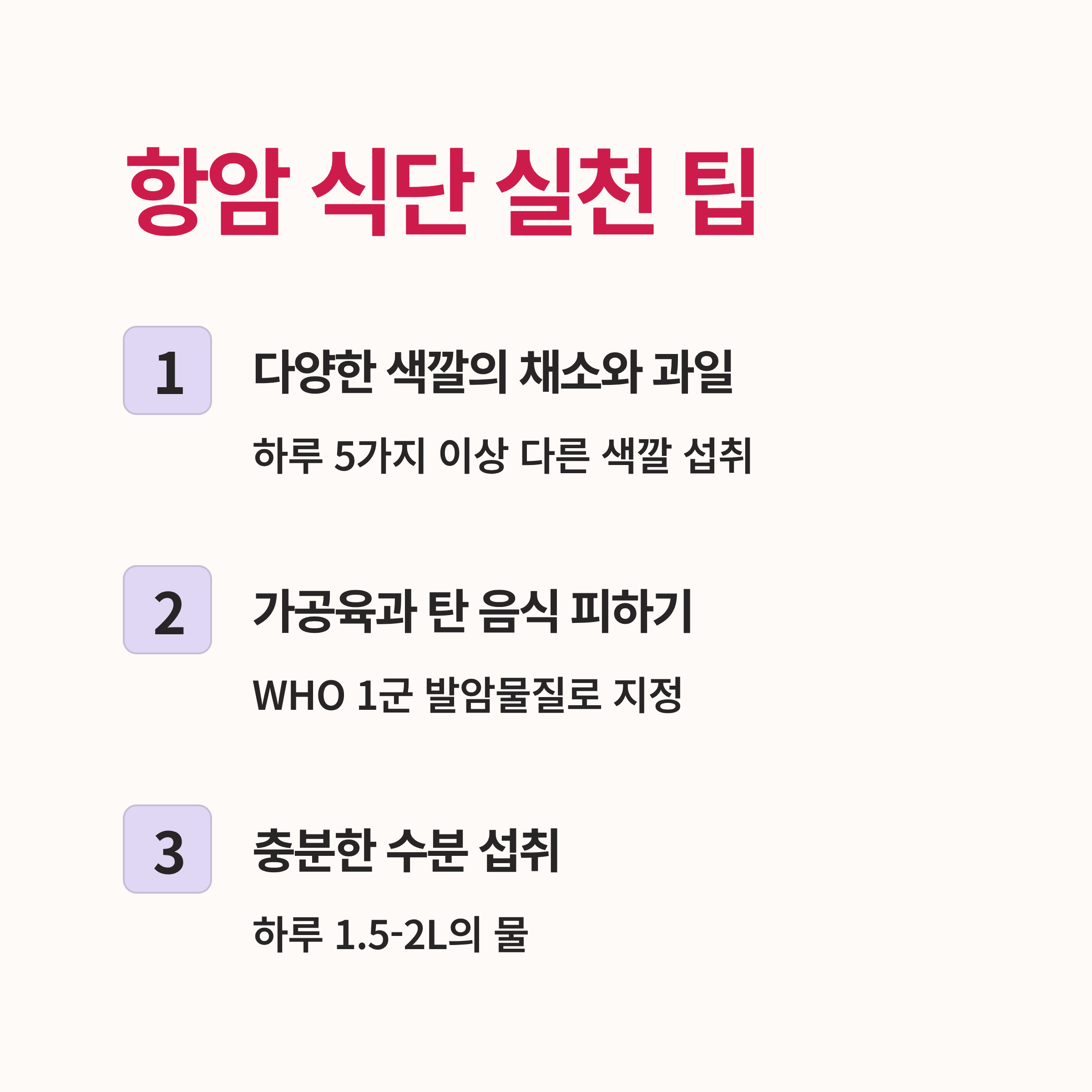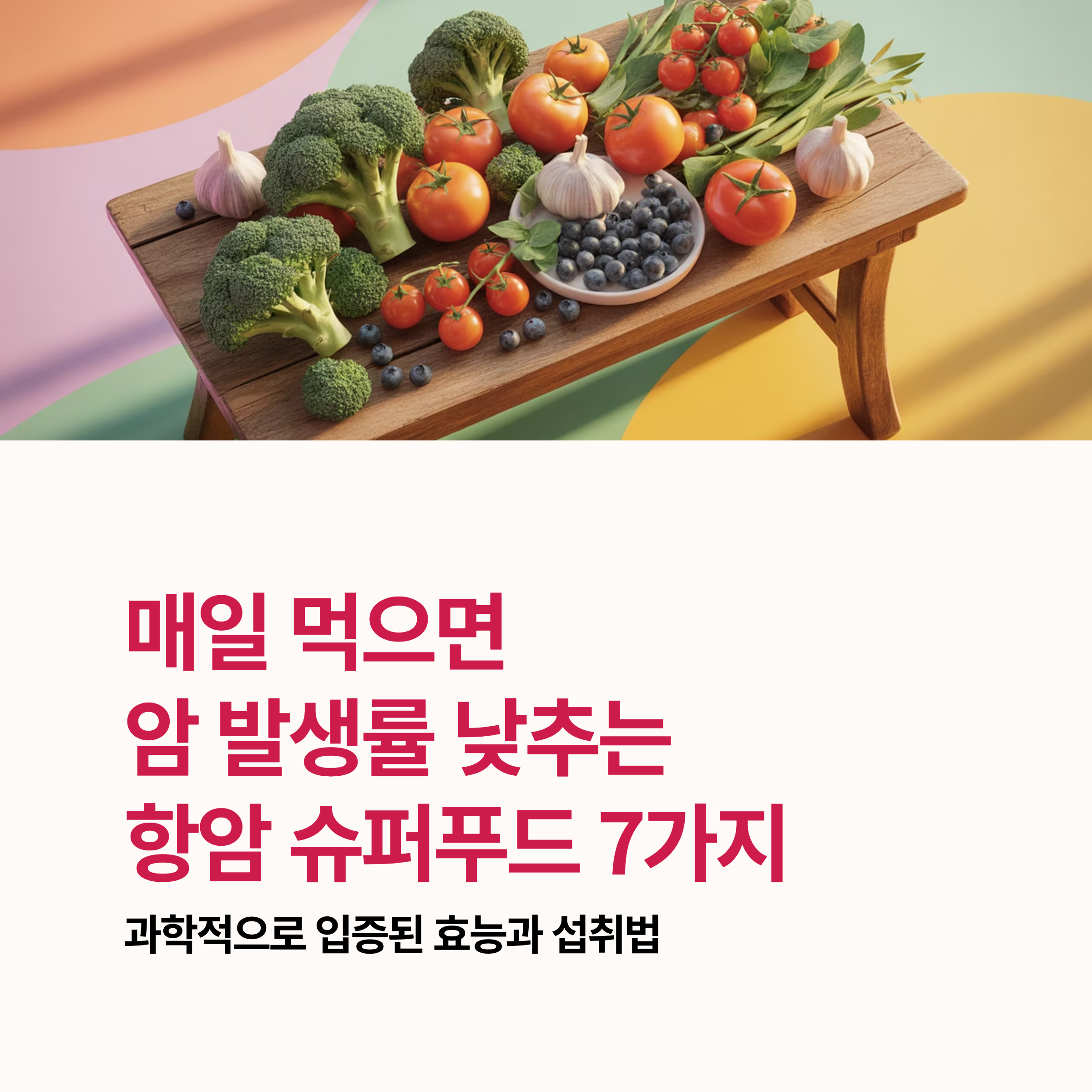 의료 면책 조항: 이 글은 일반적인 건강 정보 제공을 목적으로 하며, 개인의 진단이나 치료를 대체할 수 없습니다. 암 예방 및 관리에 대해서는 반드시 전문의와 상담하시기 바랍니다. 항암 치료 중인 경우 식단 변경 전 주치의와 반드시 상의하세요.