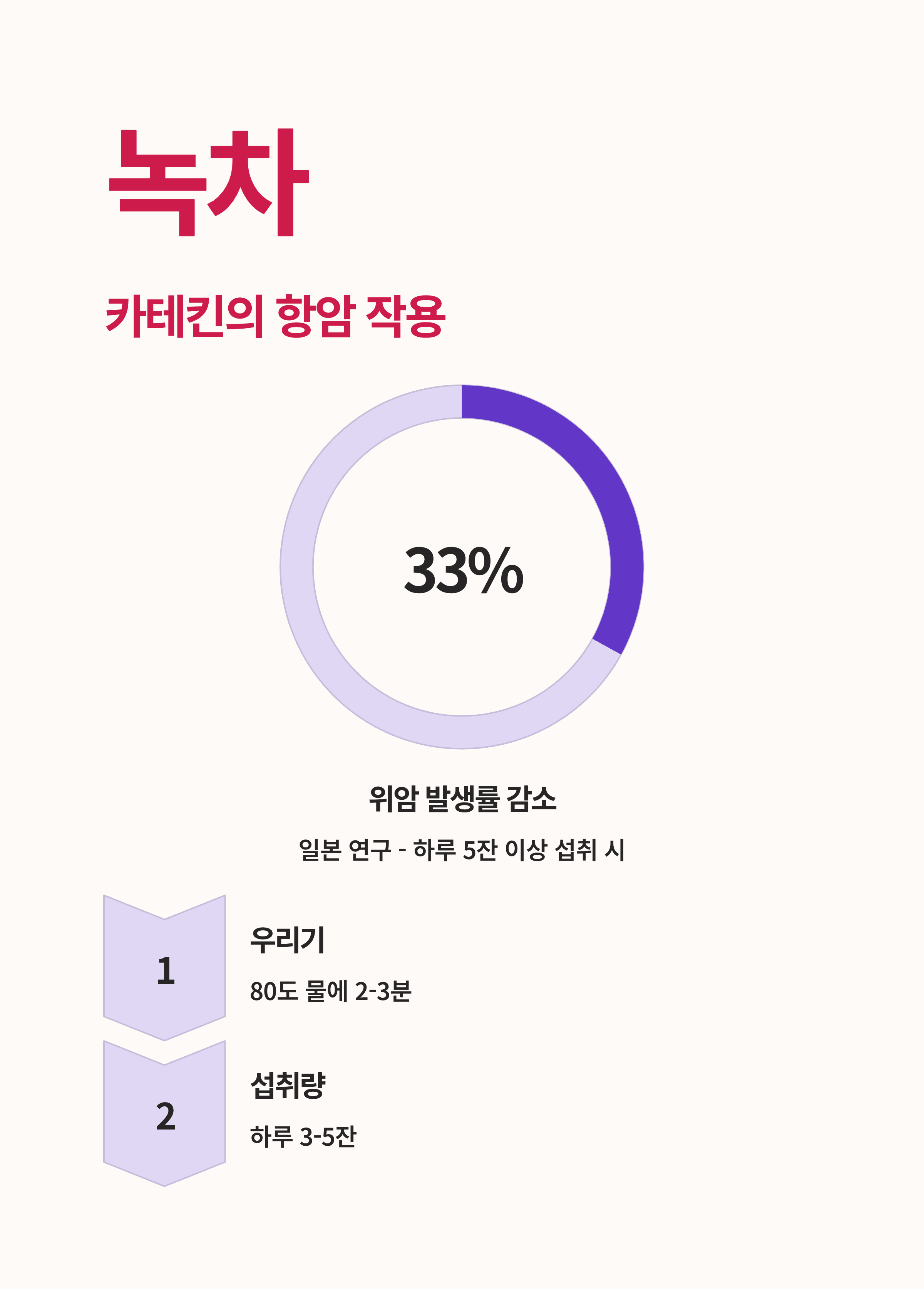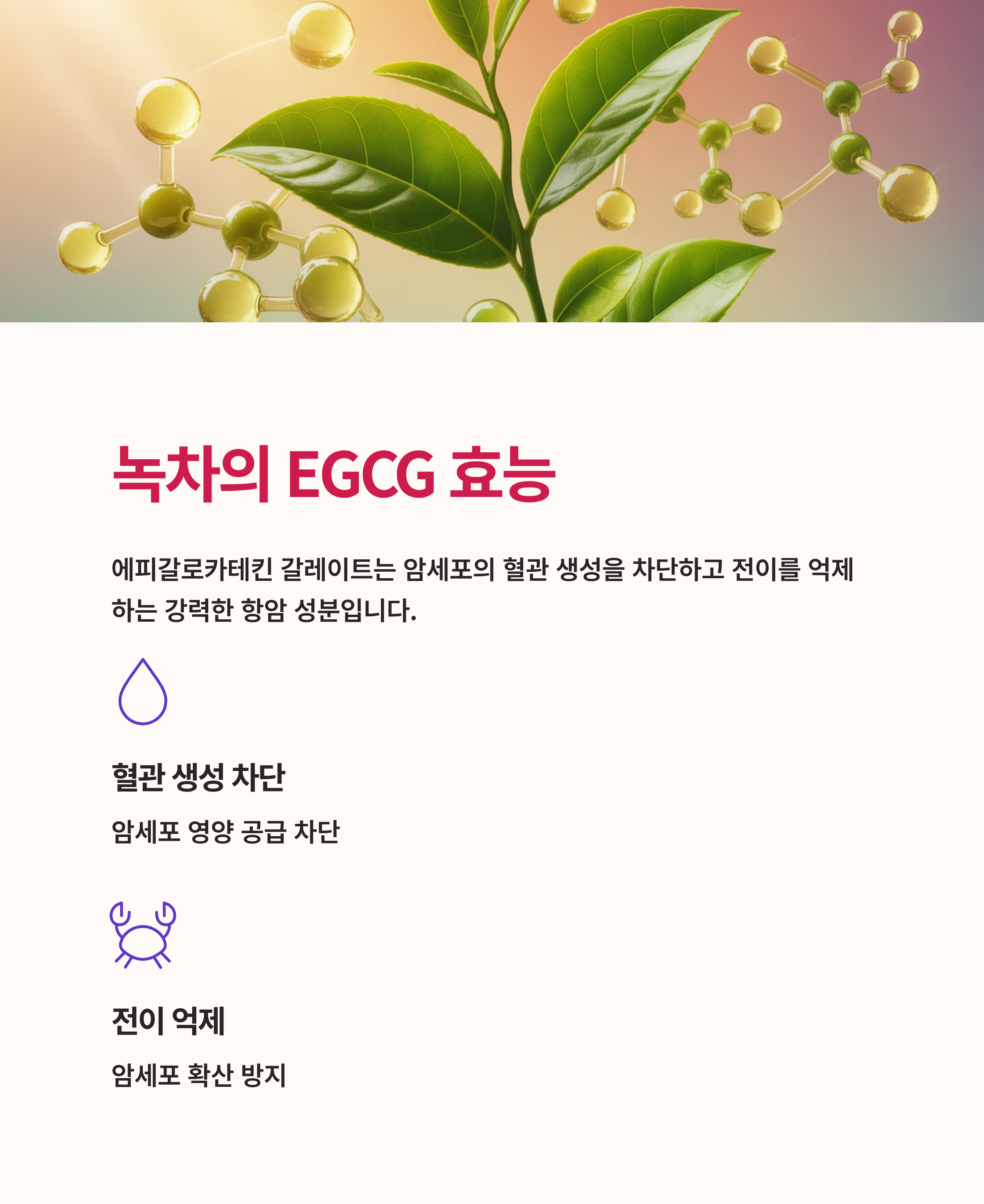 녹차의 EGCG(에피갈로카테킨 갈레이트)는 암세포의 혈관 생성을 차단하고 전이를 억제합니다. 일본 연구에서 하루 5잔 이상 녹차를 마신 여성의 위암 발생률이 33% 낮았습니다. 80도 정도의 물에 2~3분 우려내어 하루 3~5잔 마시는 것이 좋습니다.