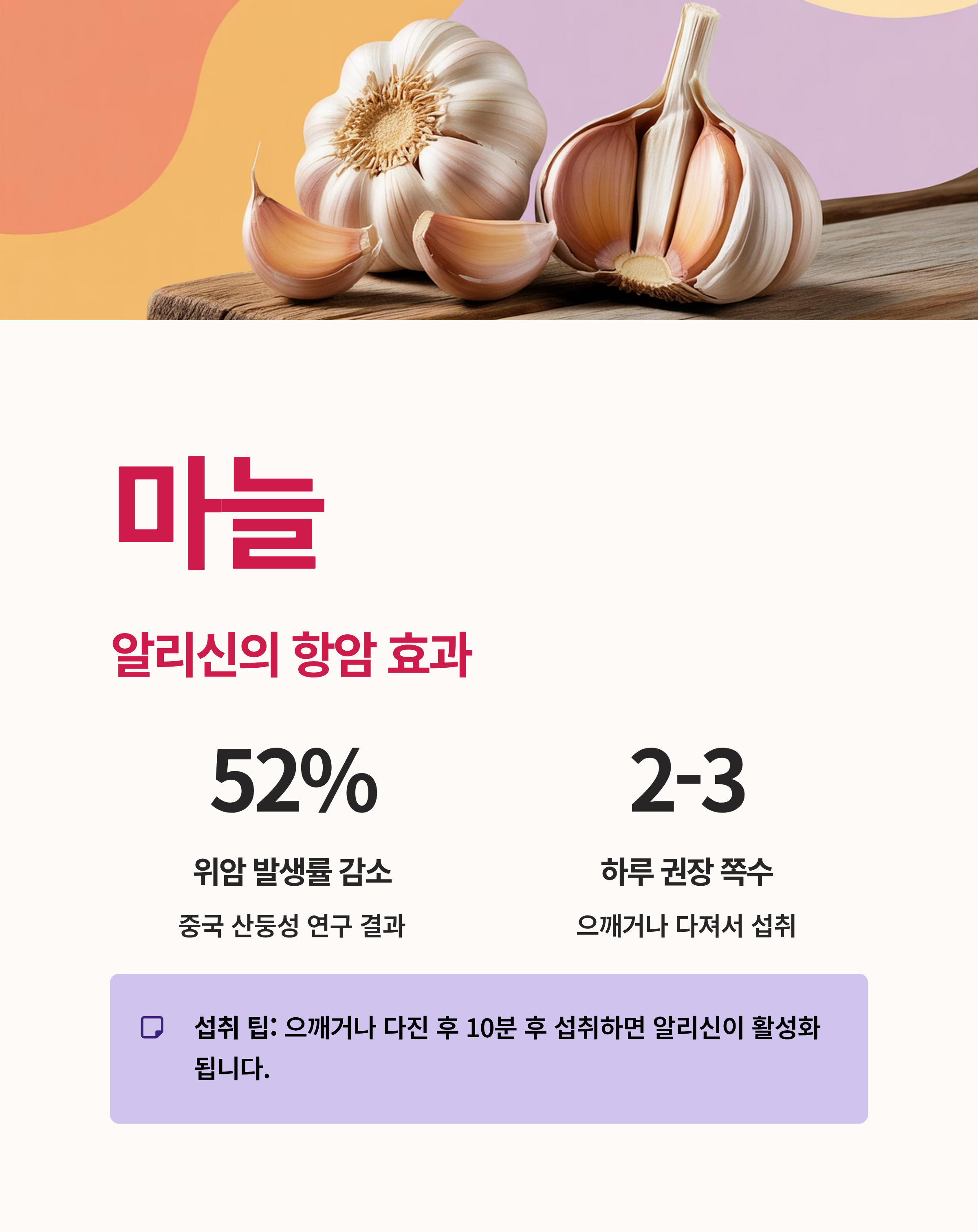 마늘에 들어있는 알리신과 유기황 화합물은 위암, 대장암 발생률을 크게 낮춥니다. 중국 산둥성 연구에 따르면 마늘을 정기적으로 섭취한 그룹의 위암 발생률이 52% 감소했다고 합니다. 하루 2~3쪽을 으깨거나 다져서 10분 후 섭취하면 알리신이 활성화됩니다.
