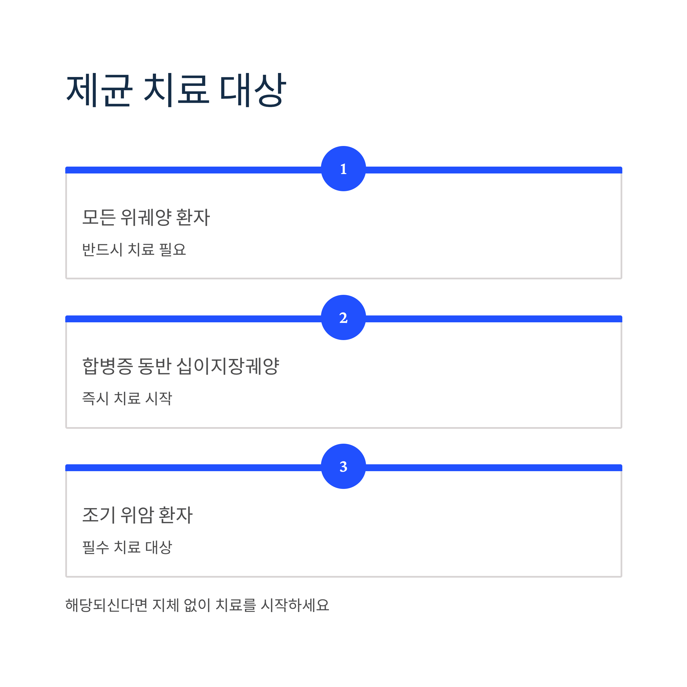 모든 위궤양 환자, 합병증을 동반한 십이지장궤양 환자, 조기 위암 환자는 반드시 제균 치료를 받아야 합니다. 치료는 위산억제제와 항생제를 혼합해 1~2주간 복용하며, 치료 후 약 70%의 균이 제거됩니다.