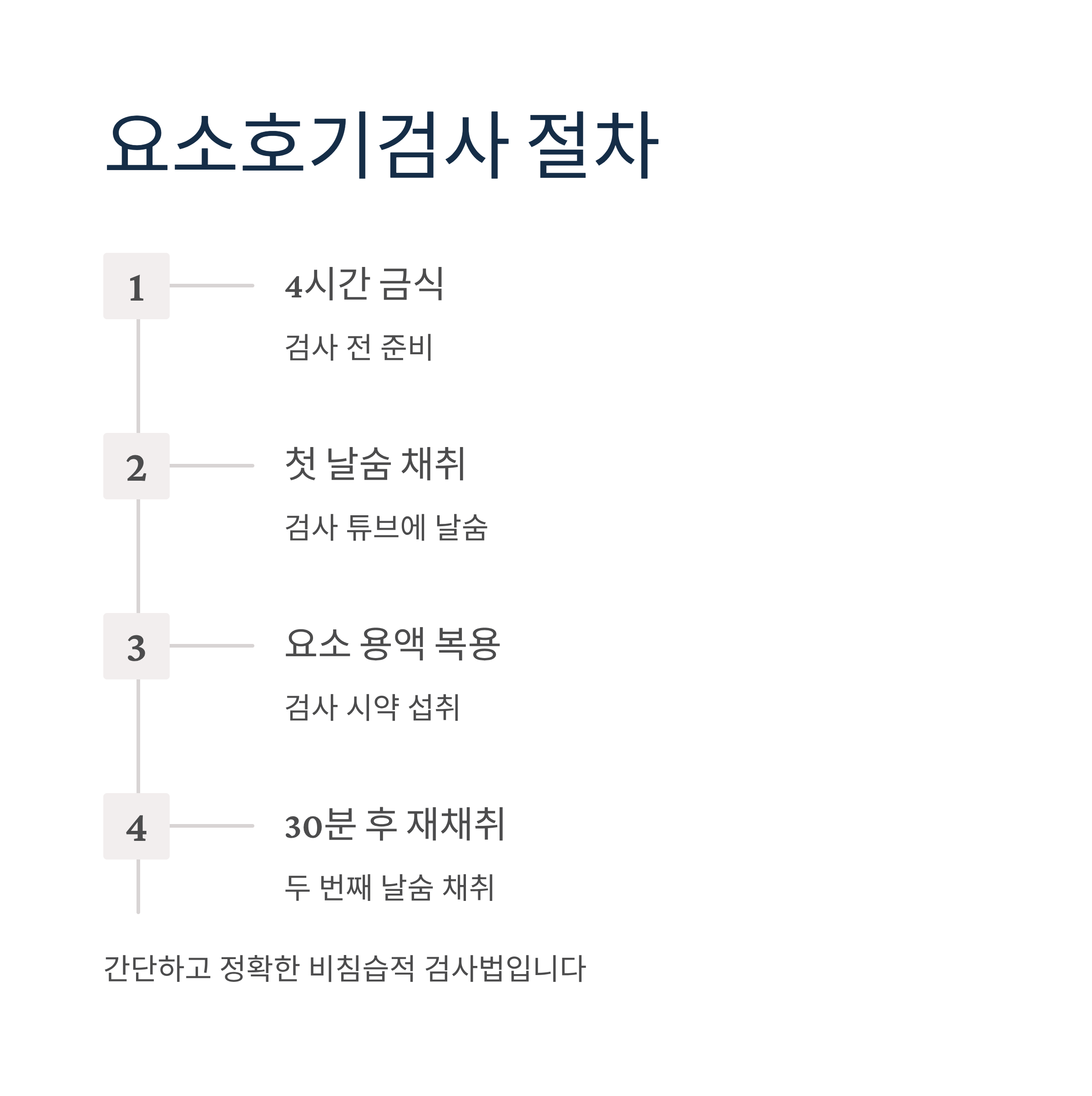 헬리코박터균 검사는 침습적 방법과 비침습적 방법으로 나뉩니다. 요소호기검사는 4시간 이상 금식 후 검사 튜브에 날숨을 불어넣고, 요소 용액을 복용한 뒤 30분 후 다시 날숨을 채취하는 간단한 방법입니다. 요소호기검사의 민감도와 특이도는 95% 이상으로 가장 정확한 진단 방법 중 하나입니다.
