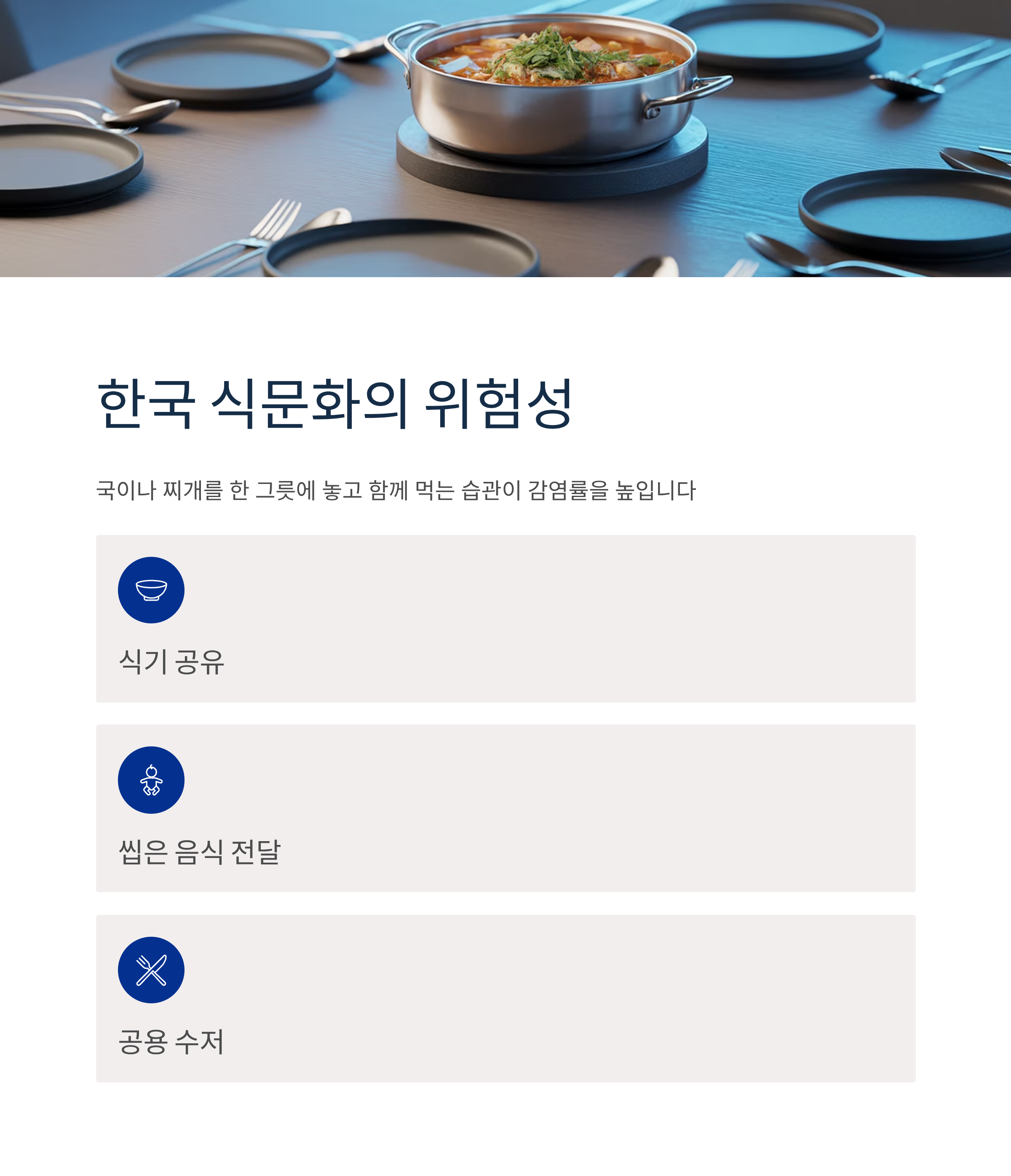 특히 국이나 찌개를 한 그릇에 놓고 함께 먹는 한국의 식문화가 감염률을 높이는 주요 원인으로 지목됩니다. 가족 간 식기 공유, 부모가 씹은 음식을 자녀에게 주는 행위도 위험합니다.