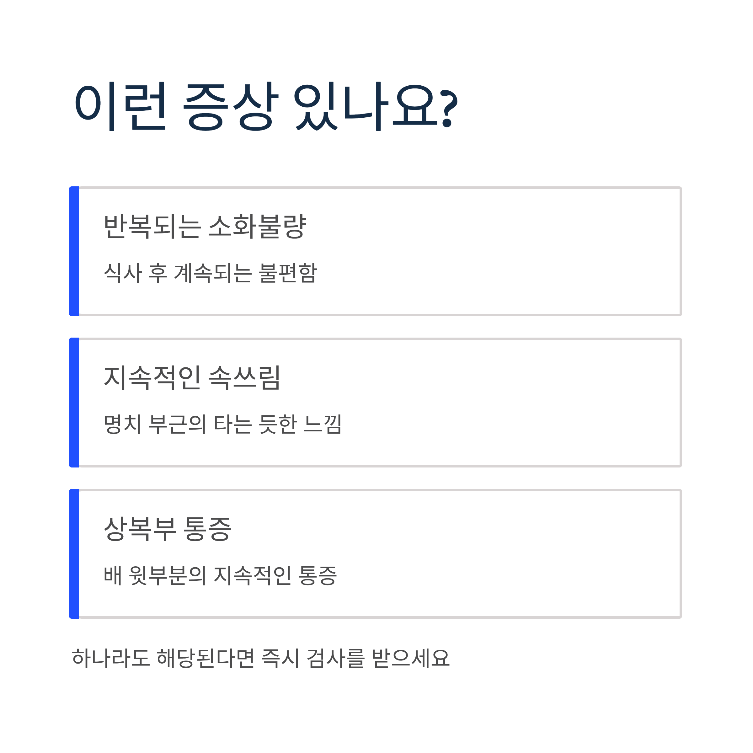 헬리코박터균에 감염되면 대부분 무증상이지만, 일부에서 소화불량, 상복부 통증, 속쓰림, 명치 불편감 등의 증상이 나타납니다. 정확한 감염 경로는 밝혀지지 않았으나 대변의 오염된 물질이 입을 통해 유입되거나, 입에서 입으로 직접 감염되는 것으로 추정됩니다.