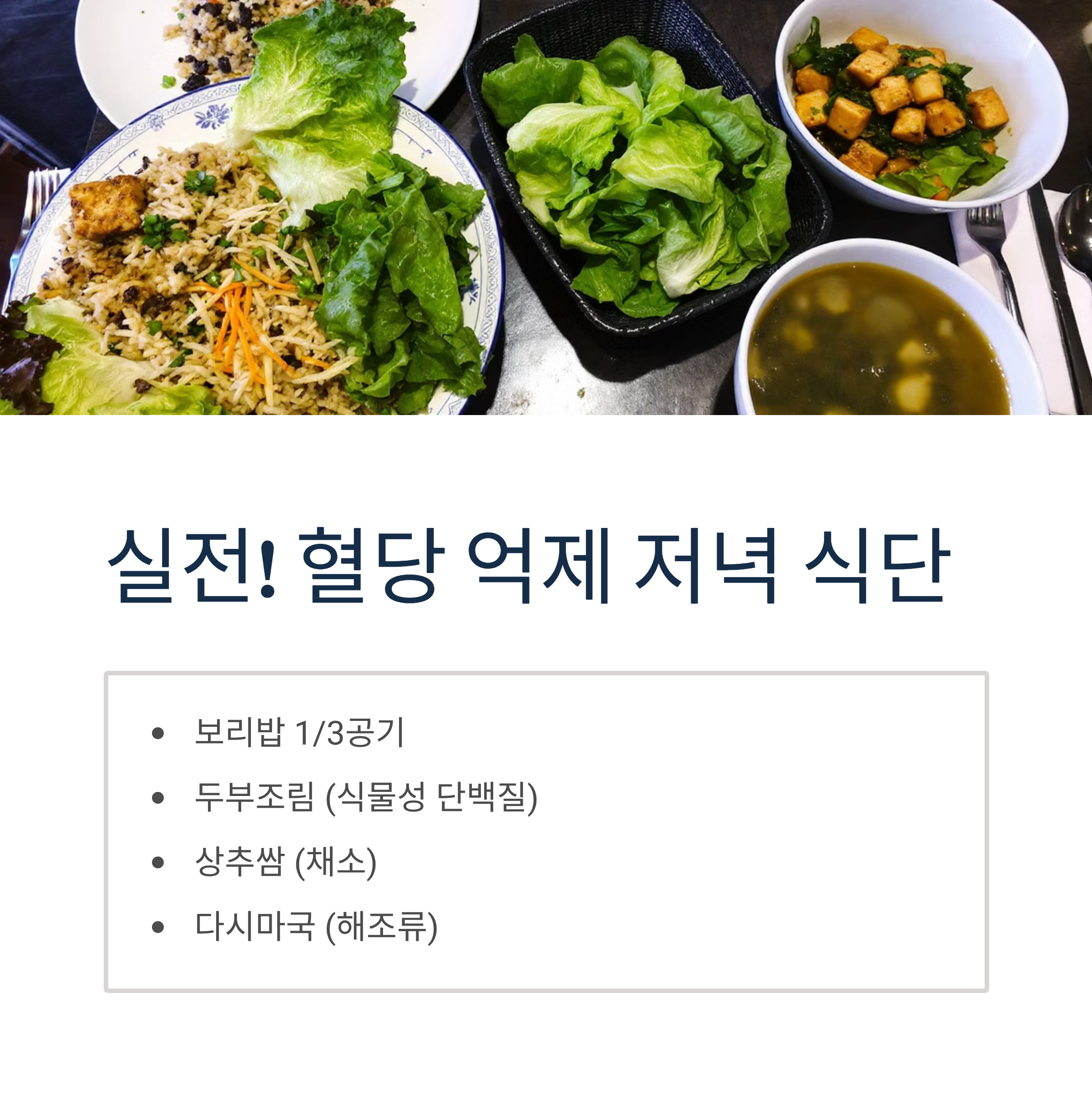 | 저녁 | 보리밥 1/3공기, 두부조림, 상추쌈, 다시마국 | 적은 탄수화물 + 식물성 단백질 |