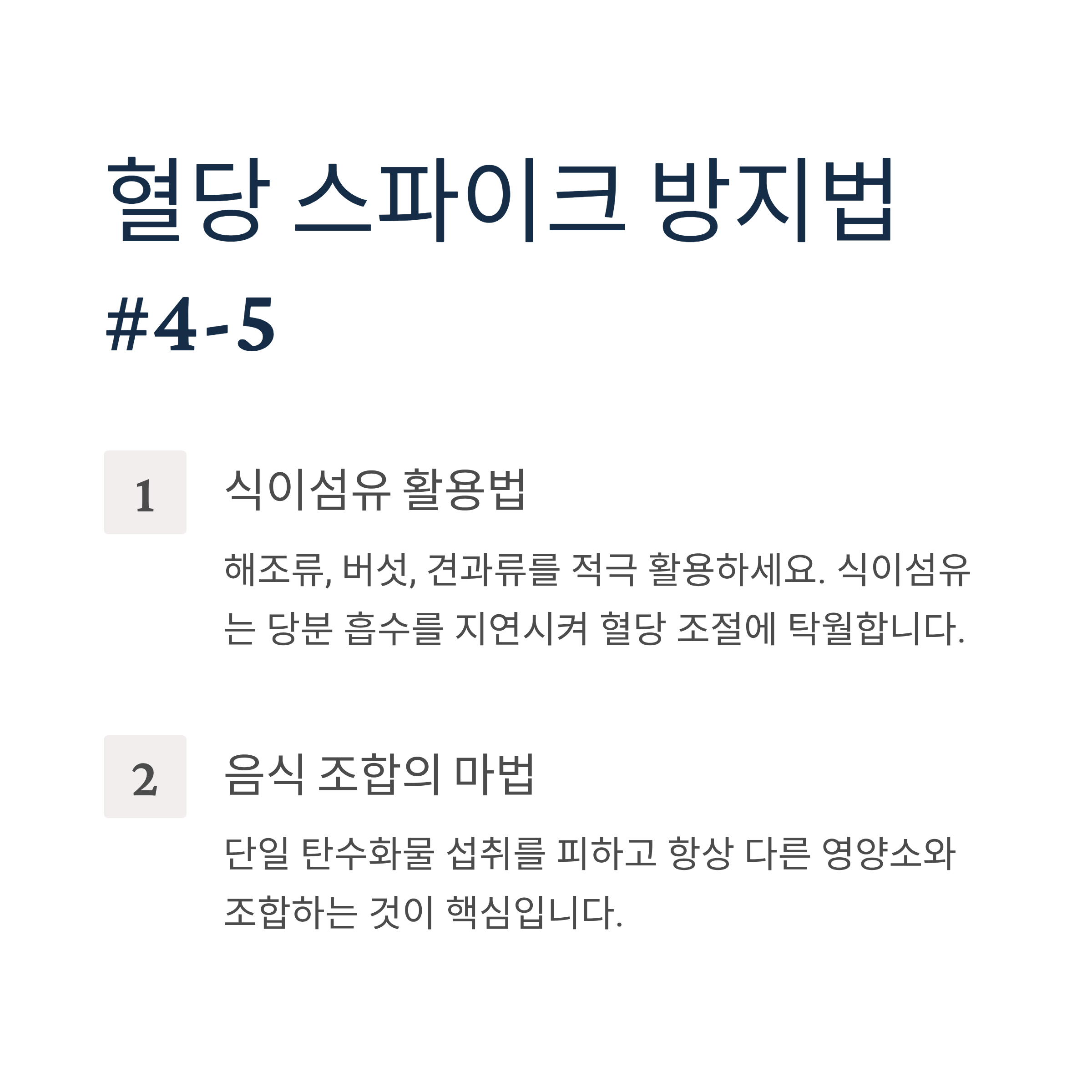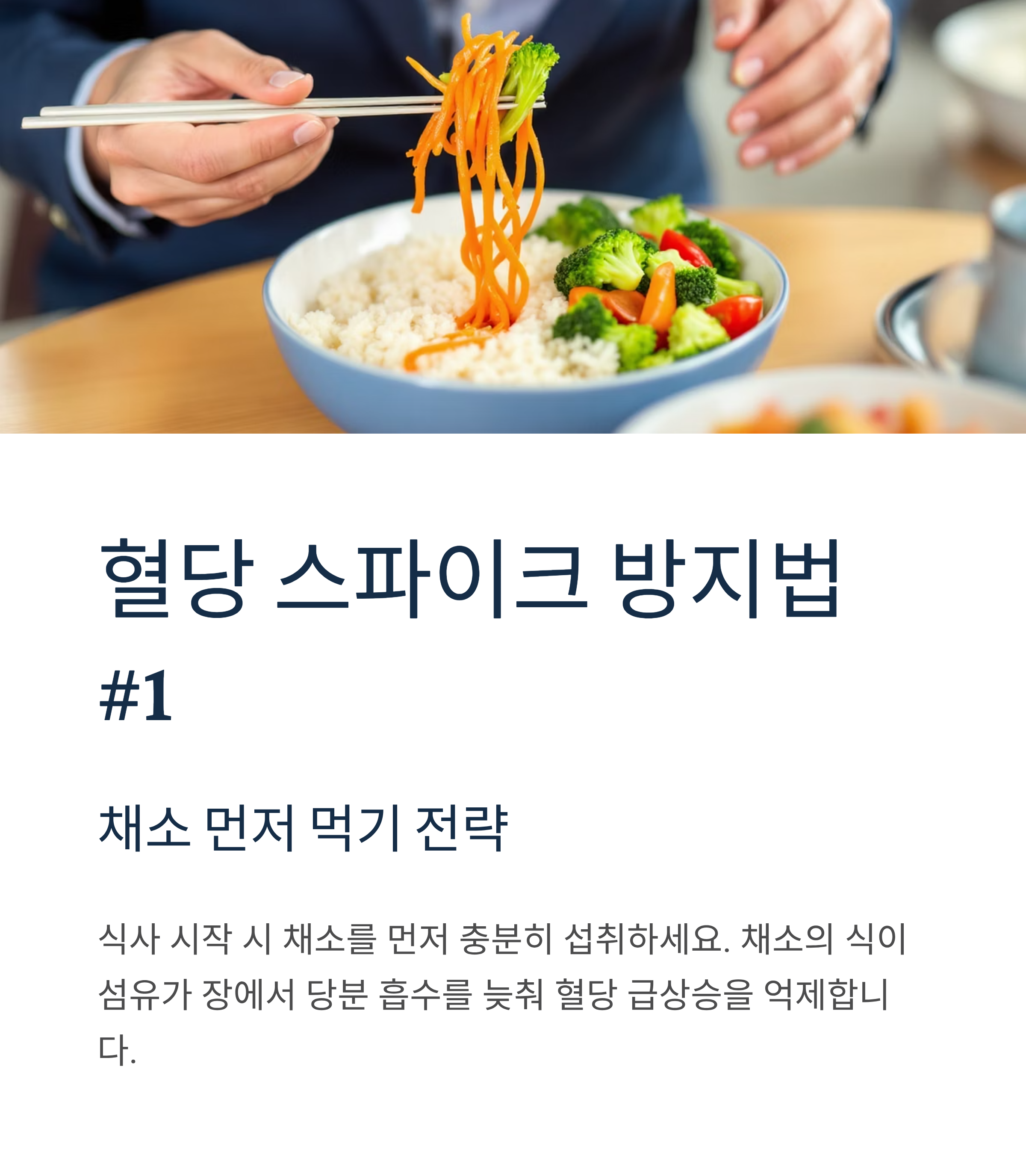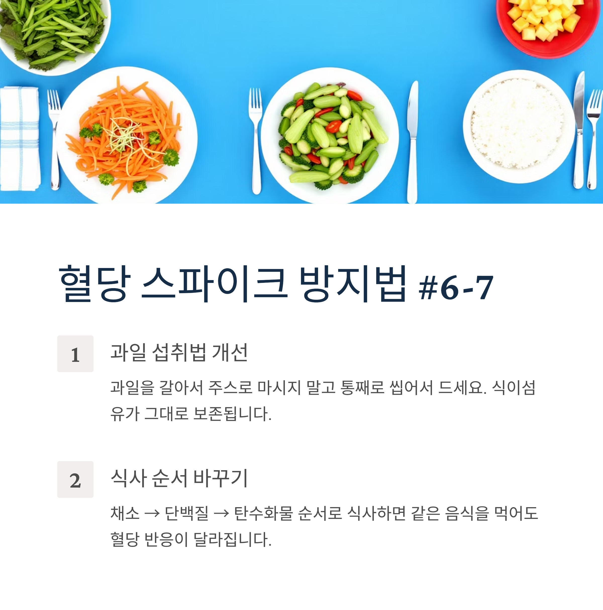 이 간단한 변화만으로도 혈당 스파이크를 현저히 줄이고, 장기적으로 당뇨병을 예방할 수 있습니다. 건강한 혈당 관리는 작은 습관의 변화에서 시작됩니다!