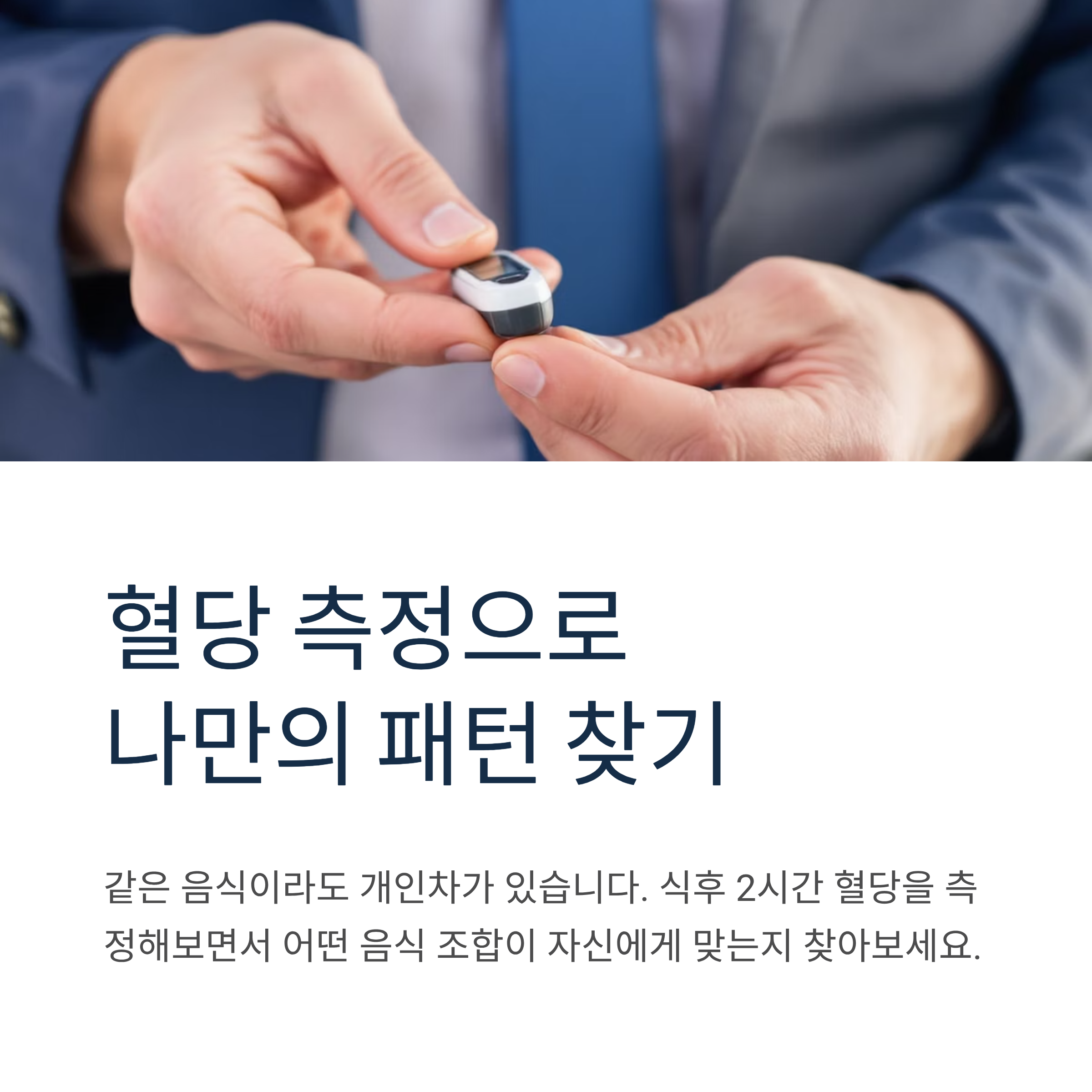 같은 음식이라도 개인차가 있습니다. 식후 2시간 혈당을 측정해보면서 어떤 음식 조합이 자신에게 맞는지 찾아보세요. 혈당 측정기를 활용하면 더 정확한 관리가 가능합니다.