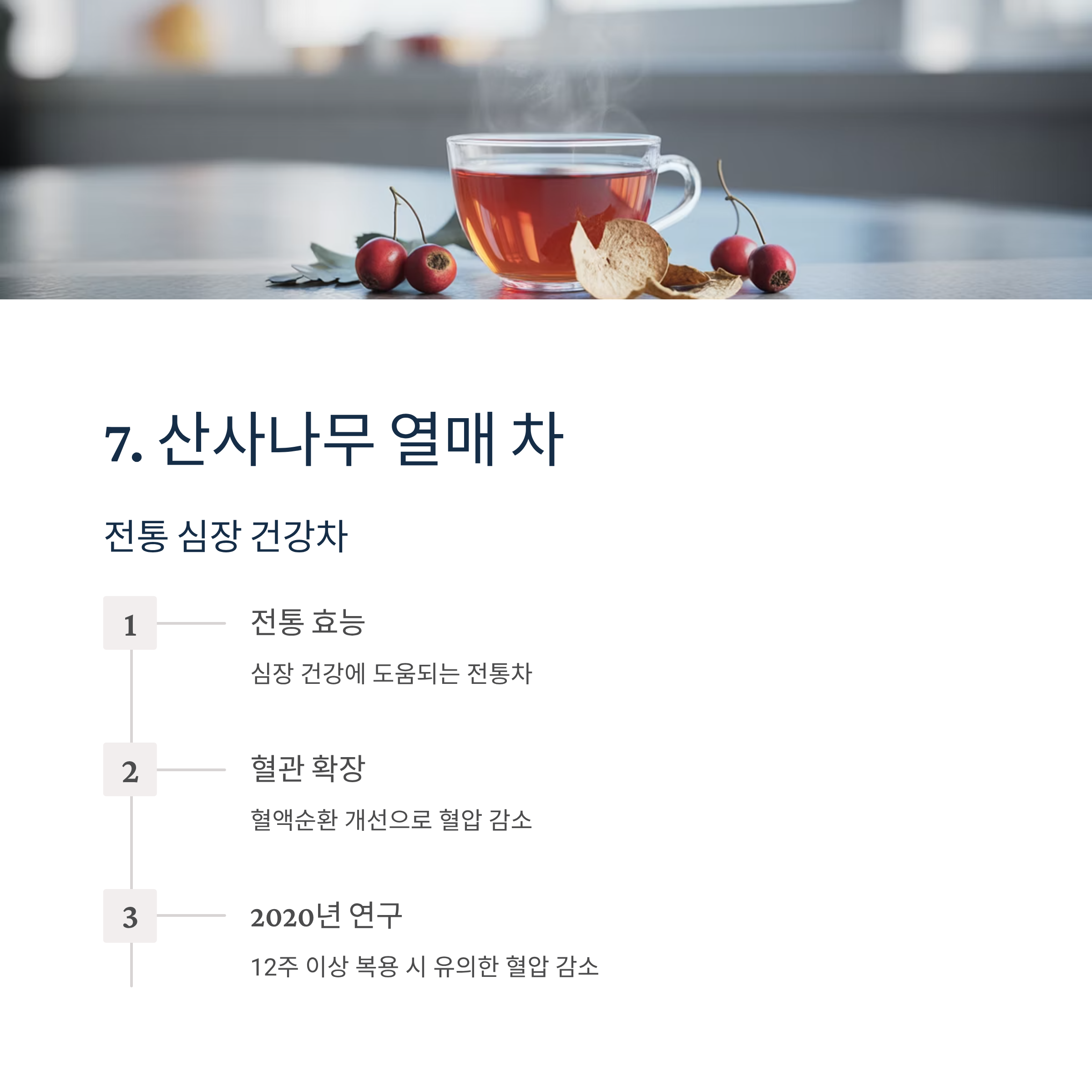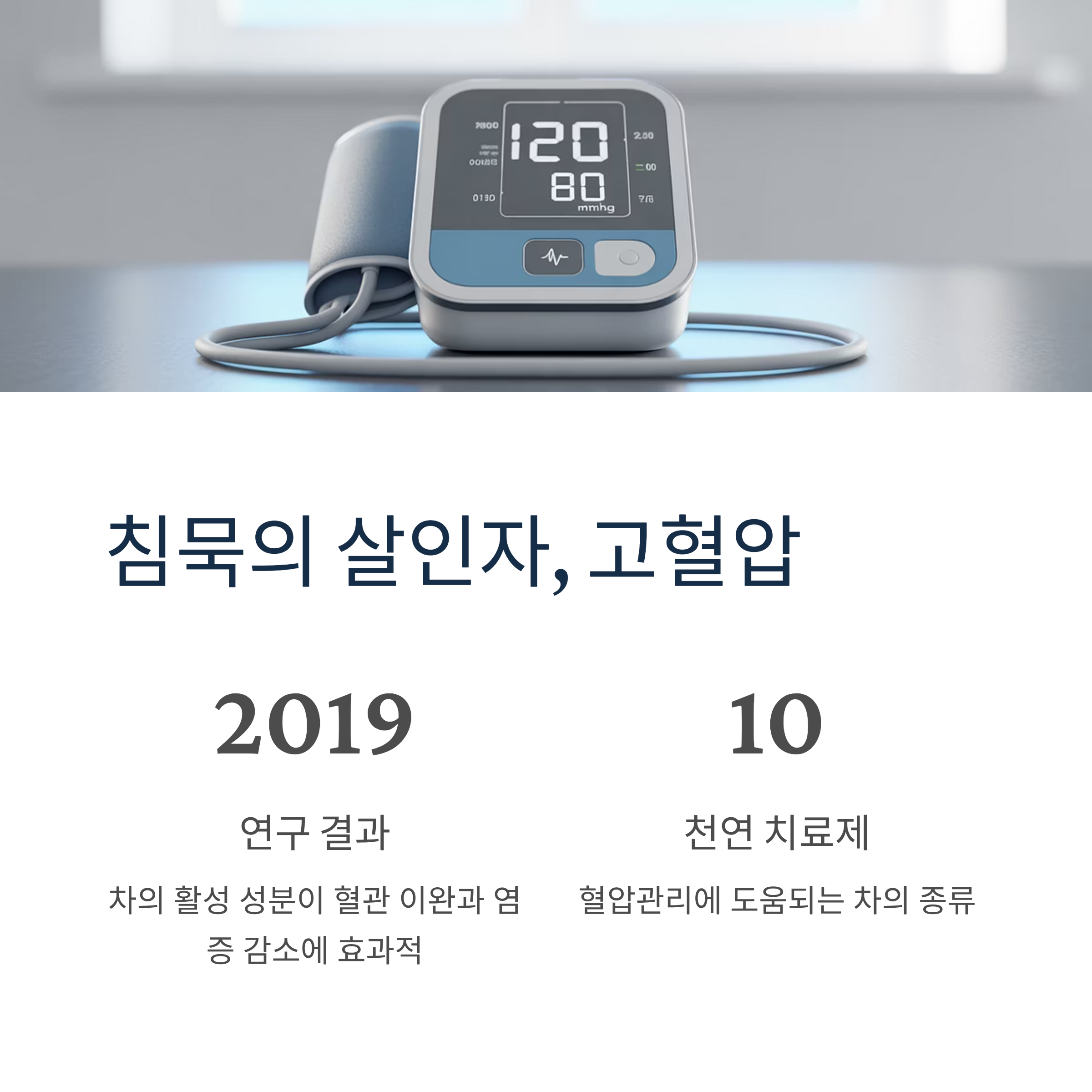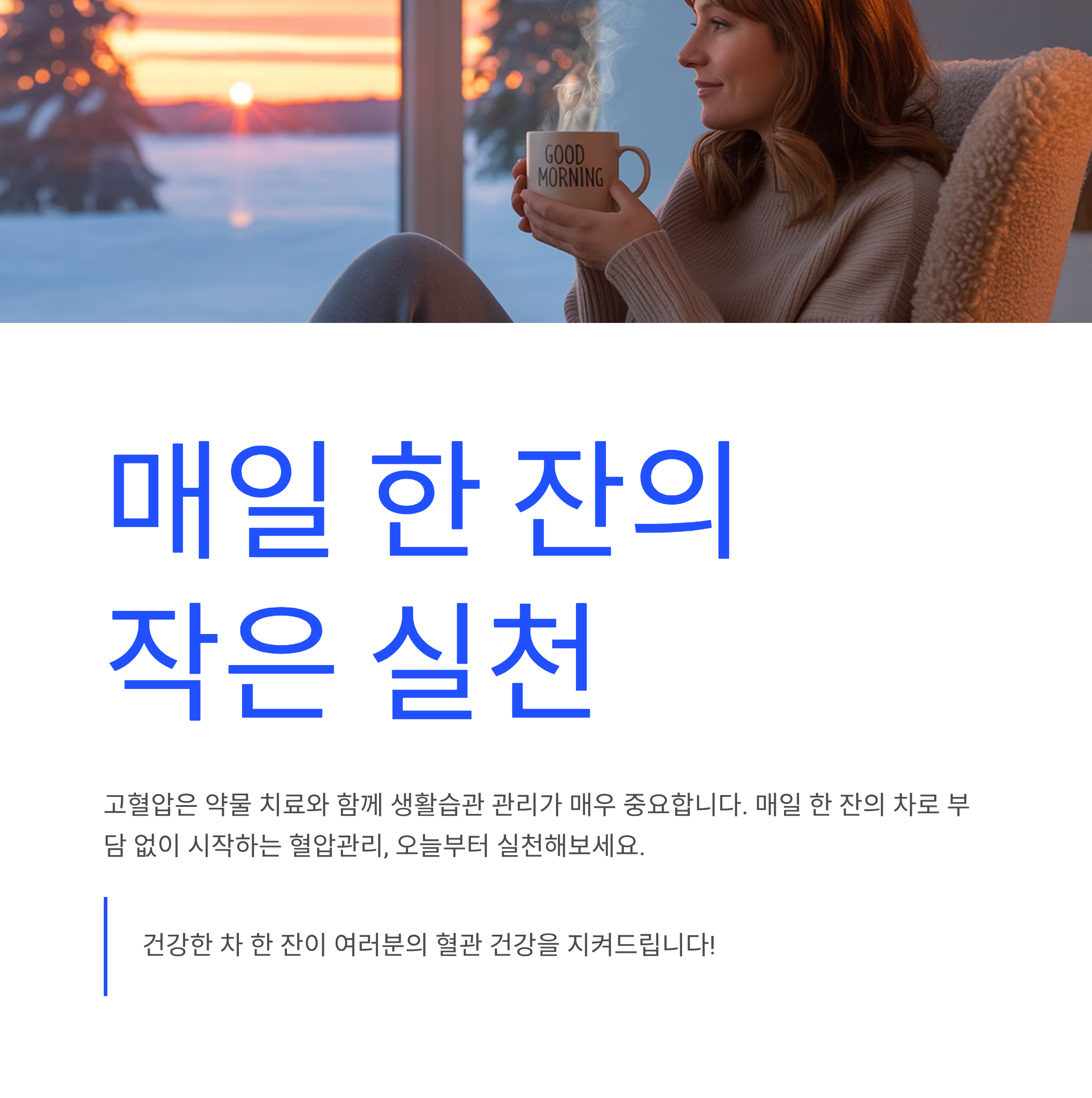 고혈압은 약물 치료와 함께 생활습관 관리가 매우 중요합니다. 매일 한 잔의 차로 부담 없이 시작하는 혈압관리, 오늘부터 실천해보세요. 단, 혈압약을 복용 중이라면 반드시 전문의와 상담 후 섭취하시기 바랍니다.