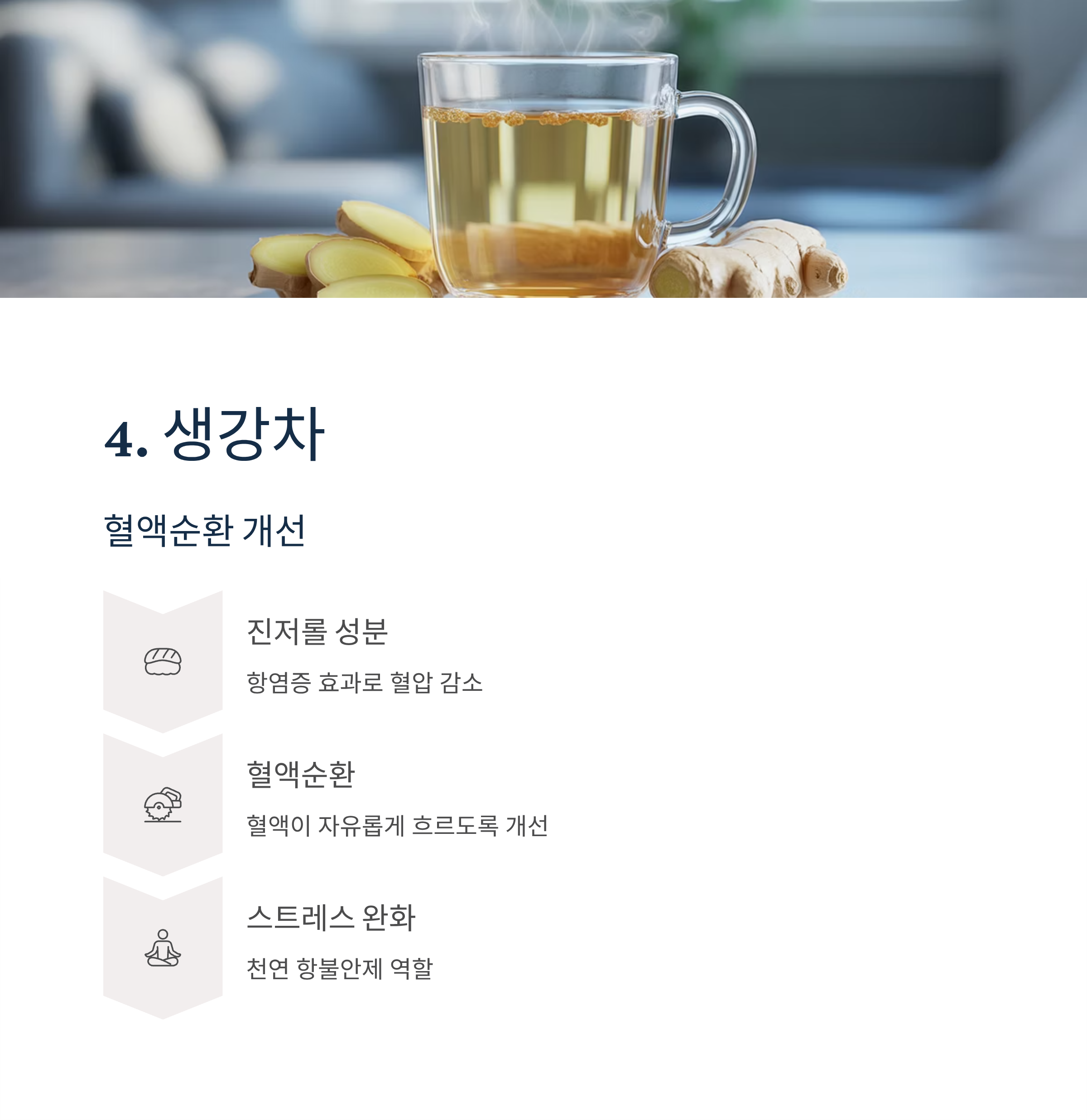 생강차는 항염증 효과가 있는 진저롤을 함유하고 있어 혈압을 낮추는 데 도움이 됩니다. 생강 성분이 혈액 순환을 개선하여 혈액이 신체를 통해 더 자유롭게 흐르도록 돕습니다.