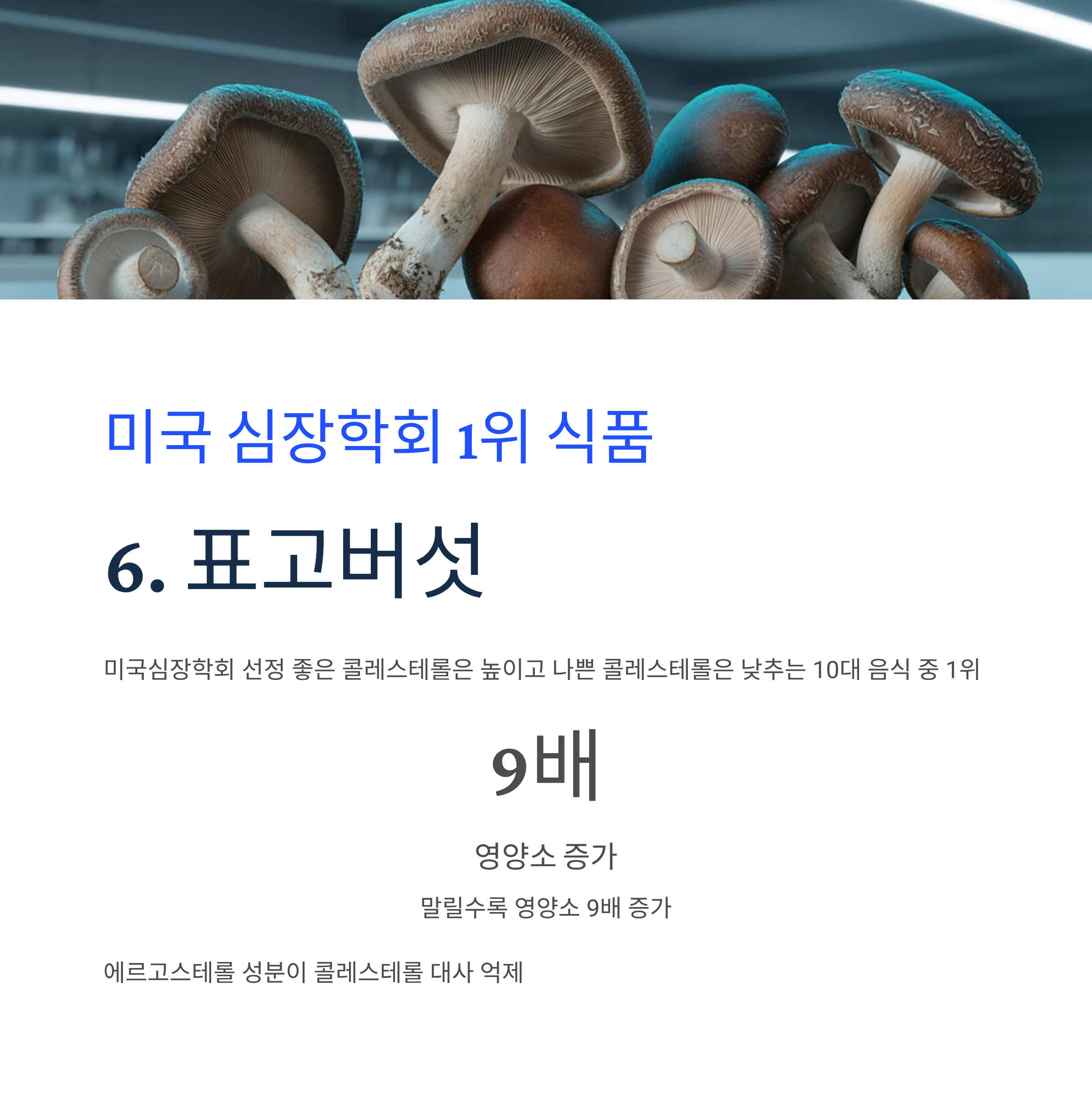 표고버섯은 미국심장학회가 선정한 좋은 콜레스테롤은 높이고 나쁜 콜레스테롤은 낮추는 10대 음식 중 1위를 차지했습니다. 에르고스테롤 성분이 콜레스테롤 대사를 억제하고 혈관에 지질이 쌓이는 것을 방지합니다. 표고버섯은 말릴수록 영양소가 9배 증가합니다.