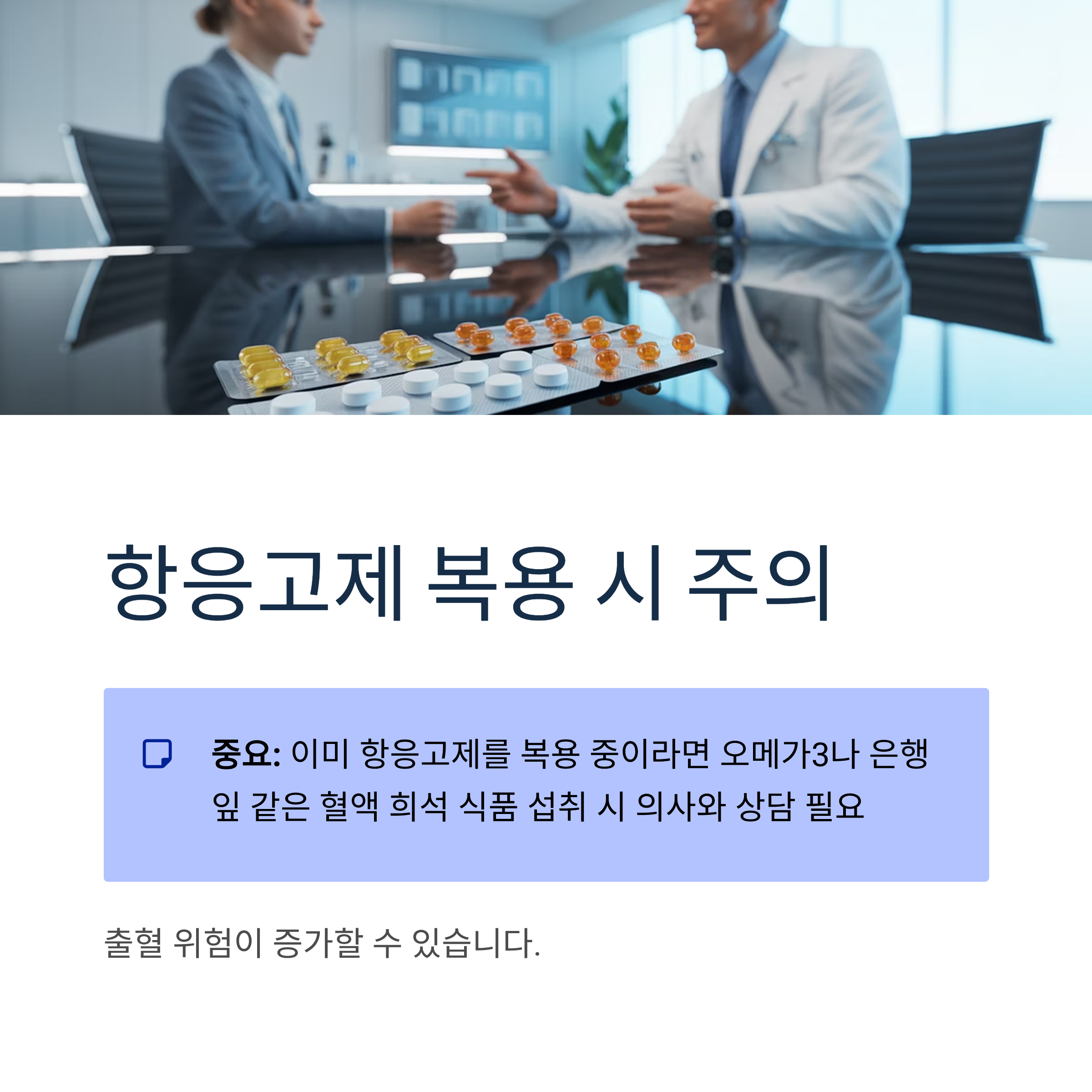 이미 항응고제를 복용 중이라면 오메가3나 은행잎 같은 혈액 희석 식품 섭취 시 의사와 상담이 필요합니다. 출혈 위험이 증가할 수 있기 때문입니다.