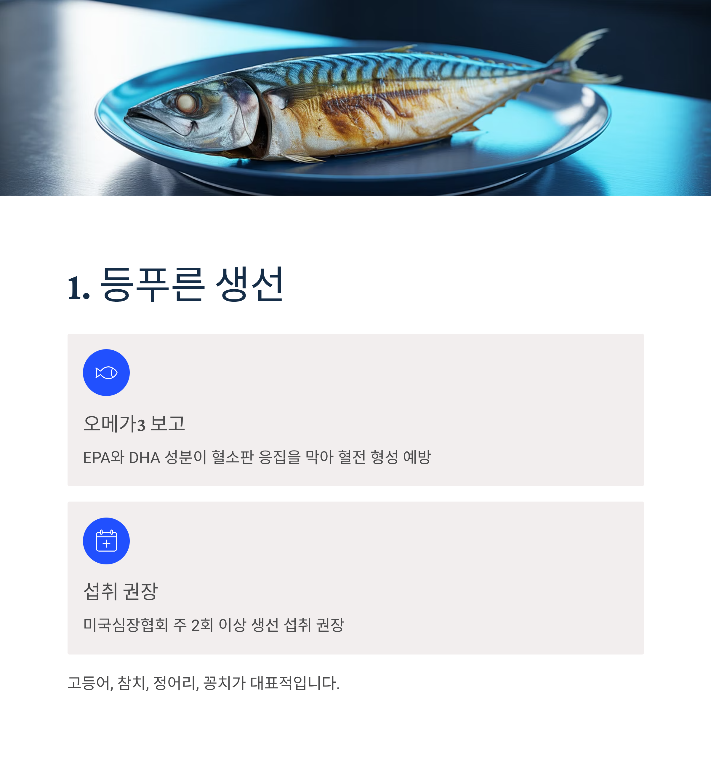 고등어, 참치, 정어리, 꽁치 같은 등푸른 생선에는 EPA와 DHA 성분이 풍부합니다. 이 불포화지방산은 혈소판 응집을 막아 혈전 형성을 예방하고, 이미 생성된 혈전을 용해하는 작용을 합니다. 미국심장협회에서는 주 2회 이상 생선 섭취를 권장하고 있으며, 한국인 대상 연구에서도 오메가3가 심혈관질환 예방에 효과적인 것으로 확인되었습니다.