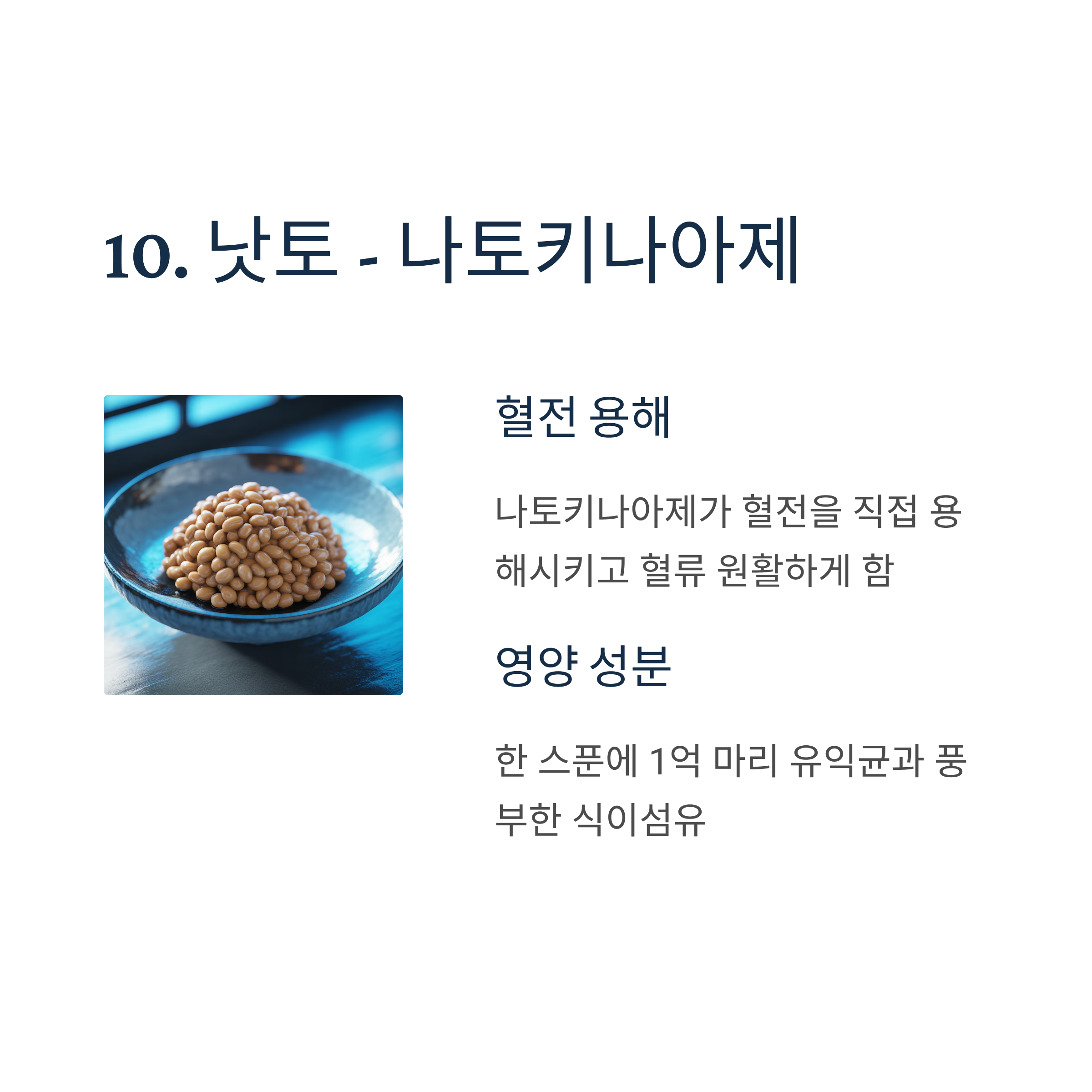 발효 콩인 낫토에는 나토키나아제 성분이 들어있어 혈전을 직접 용해시키고 혈류를 원활하게 합니다. 낫토 한 스푼에는 1억 마리의 유익균과 풍부한 식이섬유가 함유되어 있습니다.
