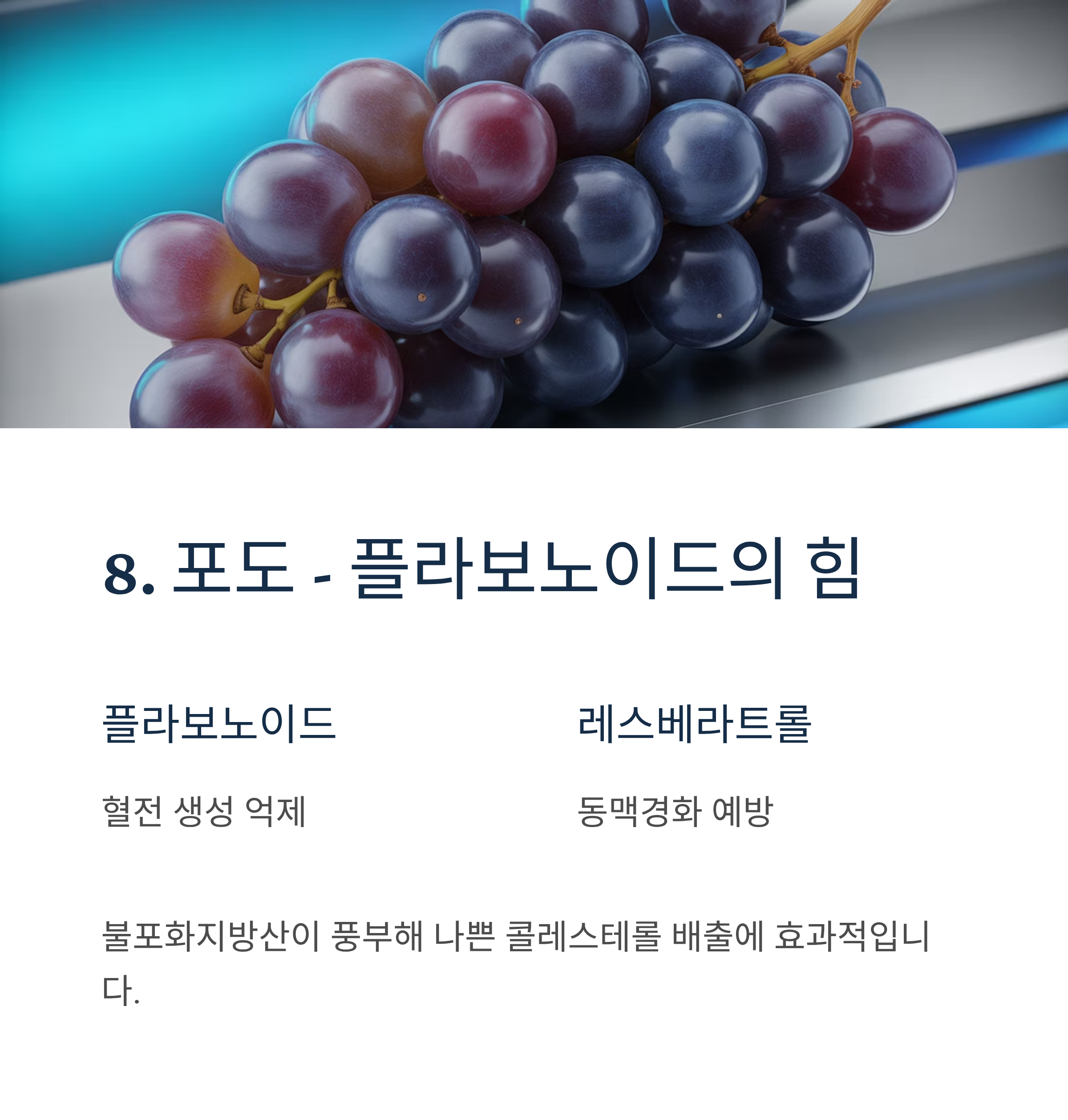 포도의 플라보노이드와 레스베라트롤 성분은 혈전 생성을 억제해 동맥경화와 심장질환 예방에 도움이 됩니다. 불포화지방산이 풍부해 나쁜 콜레스테롤 배출에도 효과적입니다.