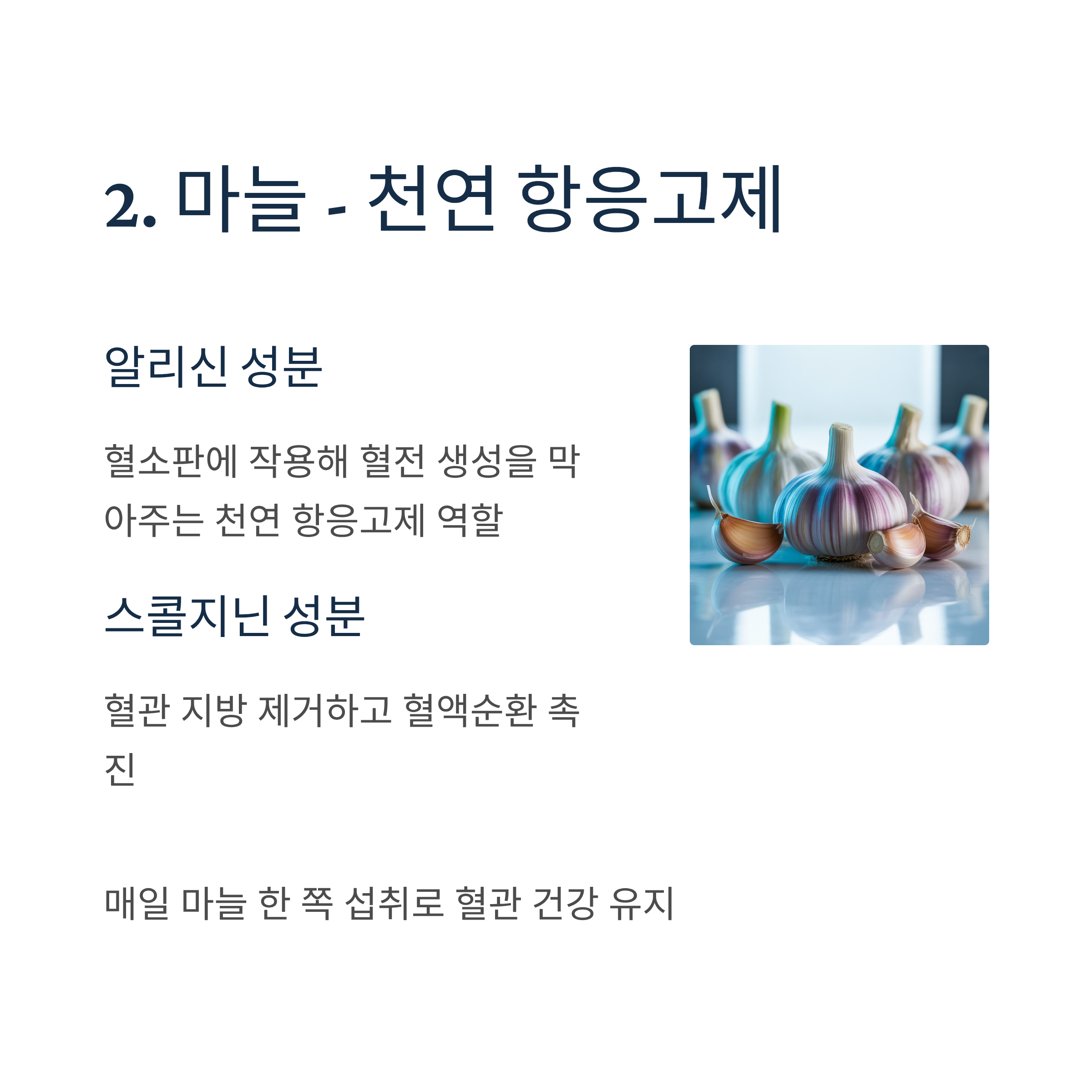 마늘의 알리신 성분은 혈소판에 작용해 혈전 생성을 막아주는 천연 항응고제 역할을 합니다. 또한 혈관에 축적된 지방을 제거하고 혈액순환을 촉진하는 스콜지닌 성분도 함유되어 있습니다. 매일 마늘 한 쪽을 섭취하면 혈관 건강 유지에 도움이 됩니다.