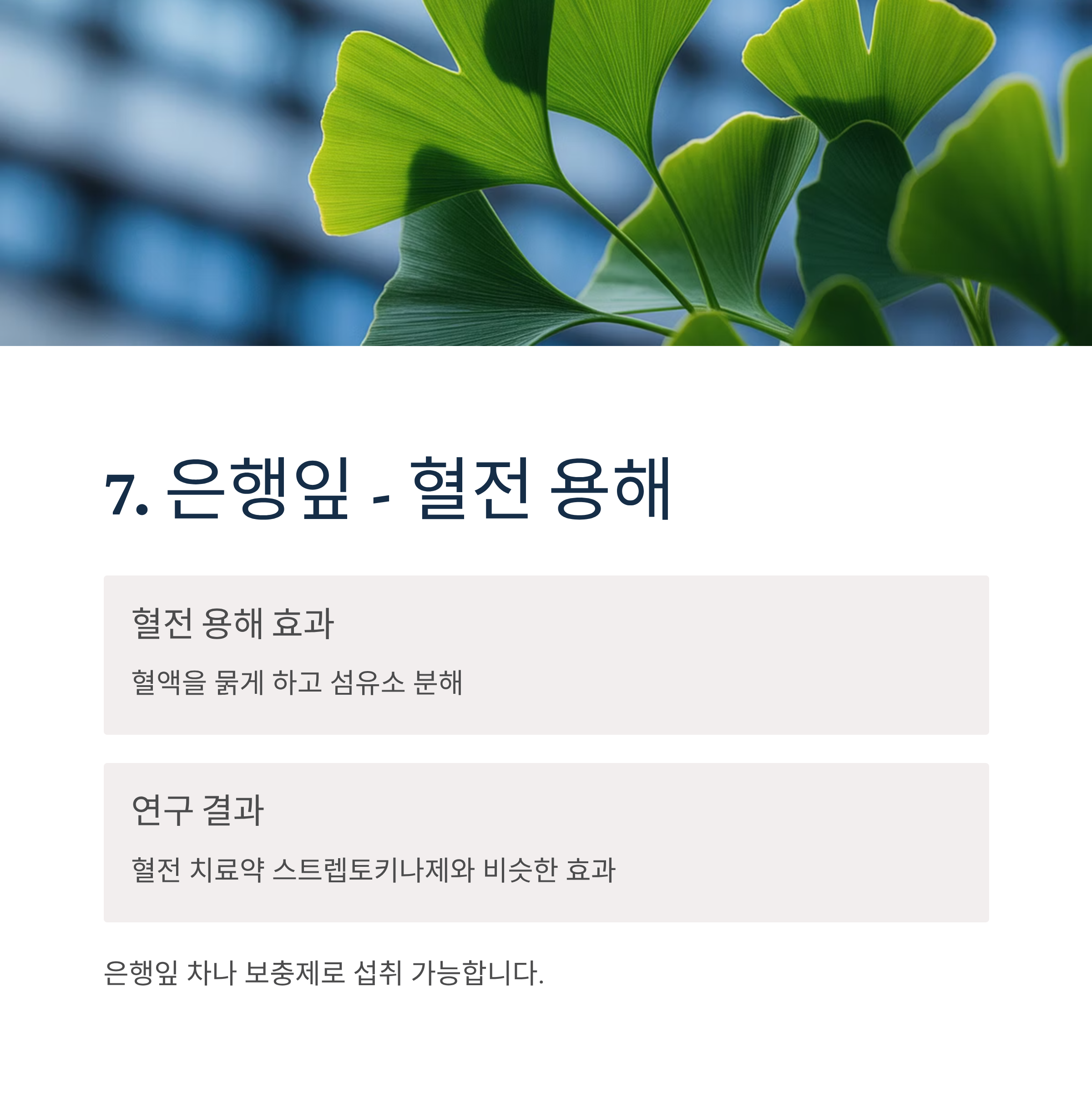 은행잎은 혈액을 묽게 하고 섬유소를 분해하는 효과가 있어 혈전을 용해시킵니다. 연구에 따르면 은행잎 추출물은 혈전 치료약인 스트렙토키나제와 비슷한 효과를 보입니다. 은행잎 차나 보충제로 섭취할 수 있습니다.