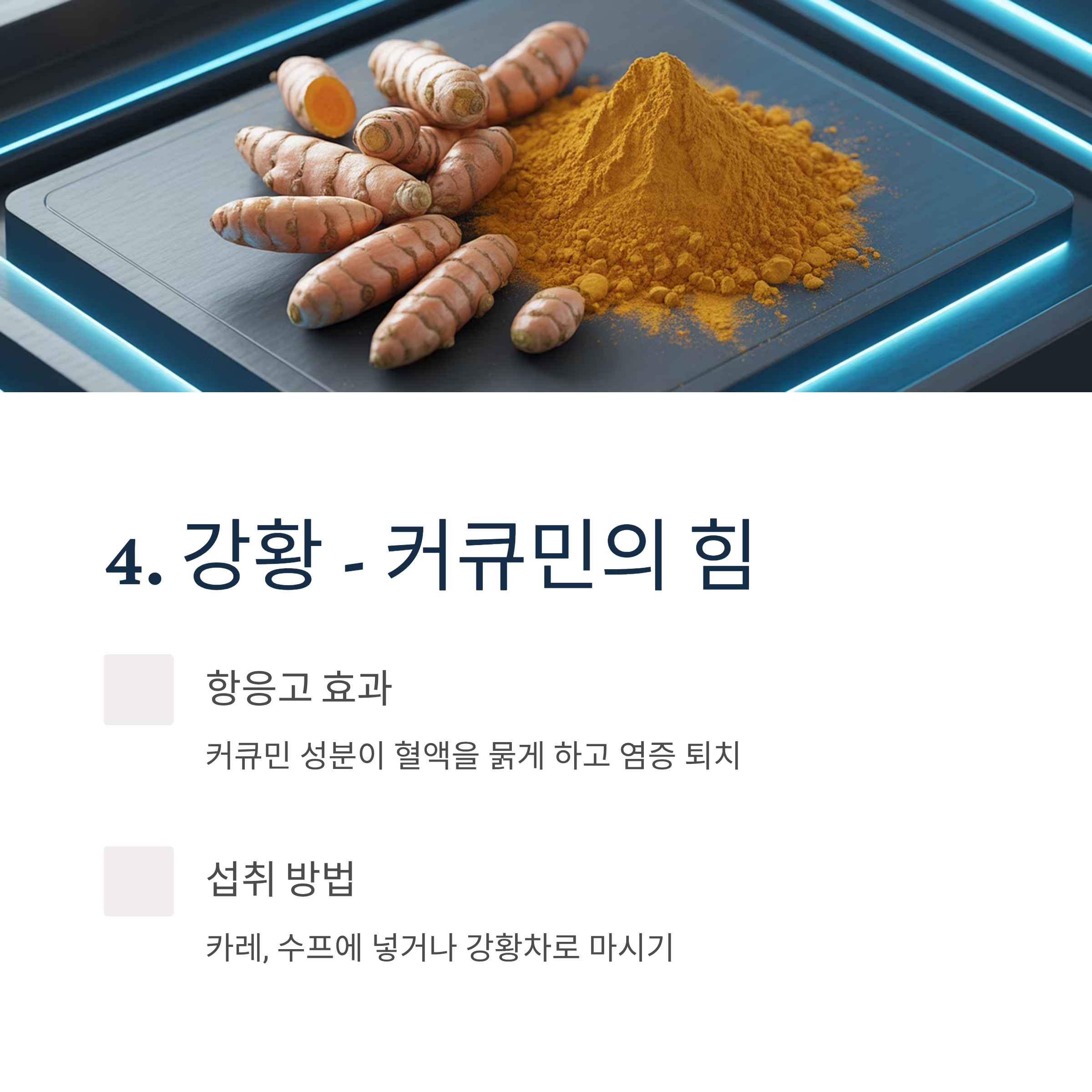 카레의 주재료인 강황에는 커큐민 성분이 풍부합니다. 커큐민은 염증을 퇴치하고 혈액을 묽게 하며 항응고 효과가 있습니다. 매일 강황을 음식에 넣어 섭취하면 혈액의 항응고 상태를 유지하는 데 도움이 됩니다. 카레, 수프에 넣거나 강황차로 마시는 것이 좋습니다.