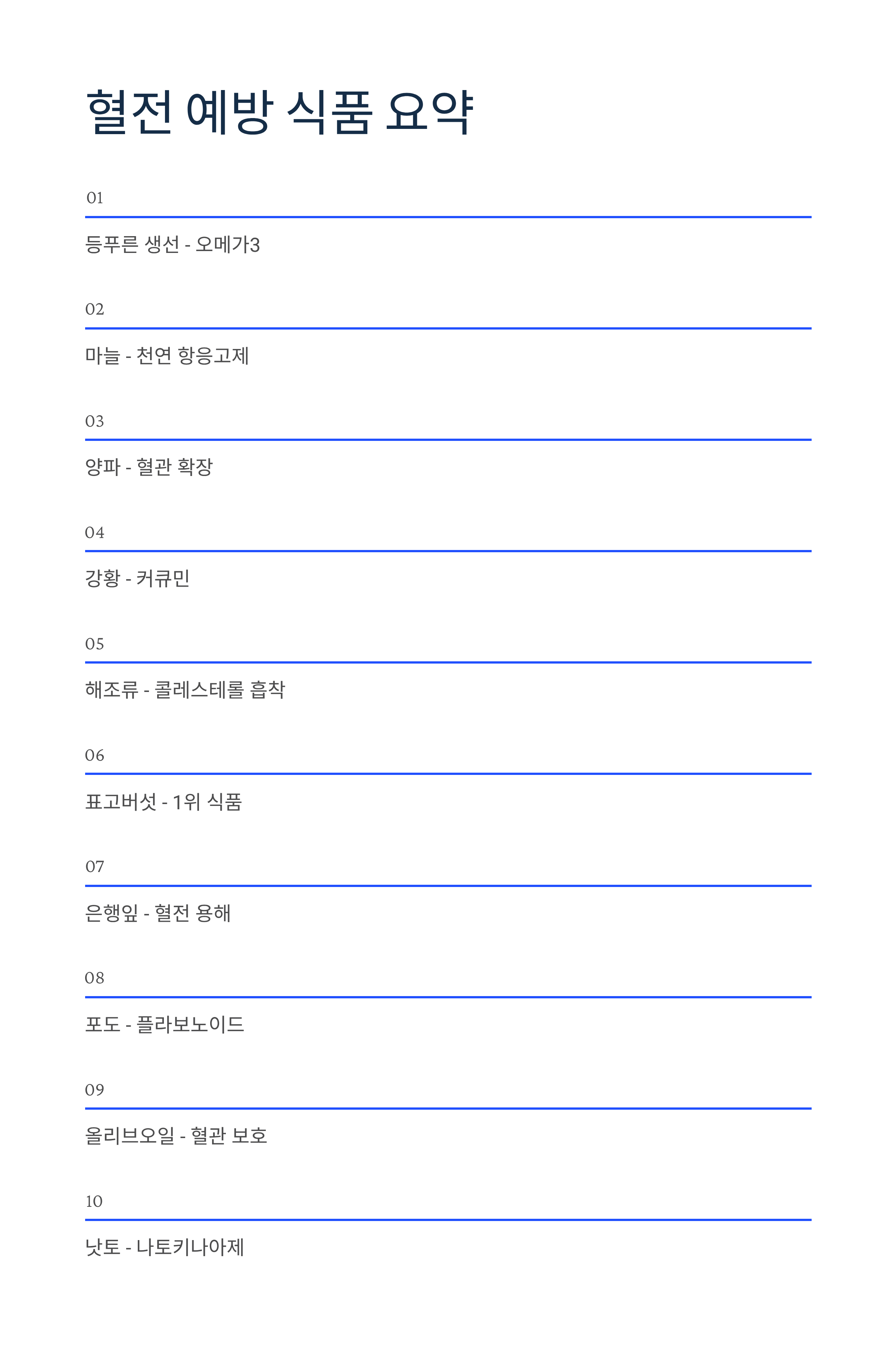 혈전은 예방이 가장 중요합니다. 오늘 소개한 10가지 식품을 꾸준히 섭취하고, 규칙적인 운동과 금연, 스트레스 관리를 병행한다면 건강한 혈관을 오래도록 유지할 수 있습니다. 작은 식습관 변화가 심근경색과 뇌경색 같은 치명적인 질환으로부터 당신을 지켜줄 것입니다.