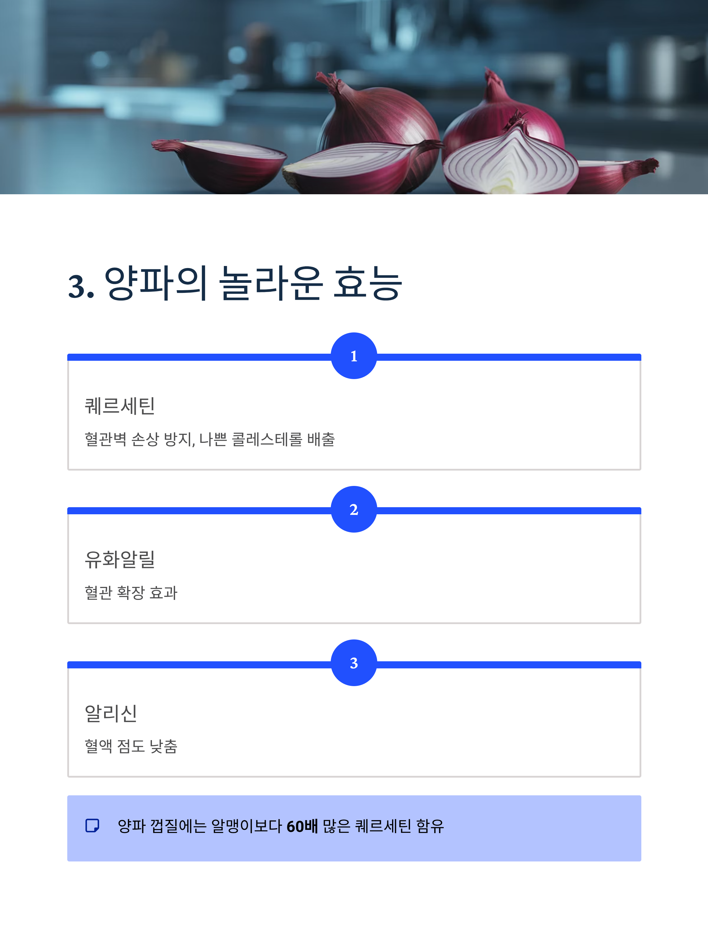 양파에 함유된 퀘르세틴은 혈관벽 손상을 막고 나쁜 콜레스테롤을 배출하는 데 효과적입니다. 특히 양파 껍질에는 알맹이보다 60배 많은 퀘르세틴이 들어있습니다. 유화알릴 성분은 혈관을 확장시키고, 알리신은 혈액 점도를 낮춰 혈전 예방에 탁월합니다.