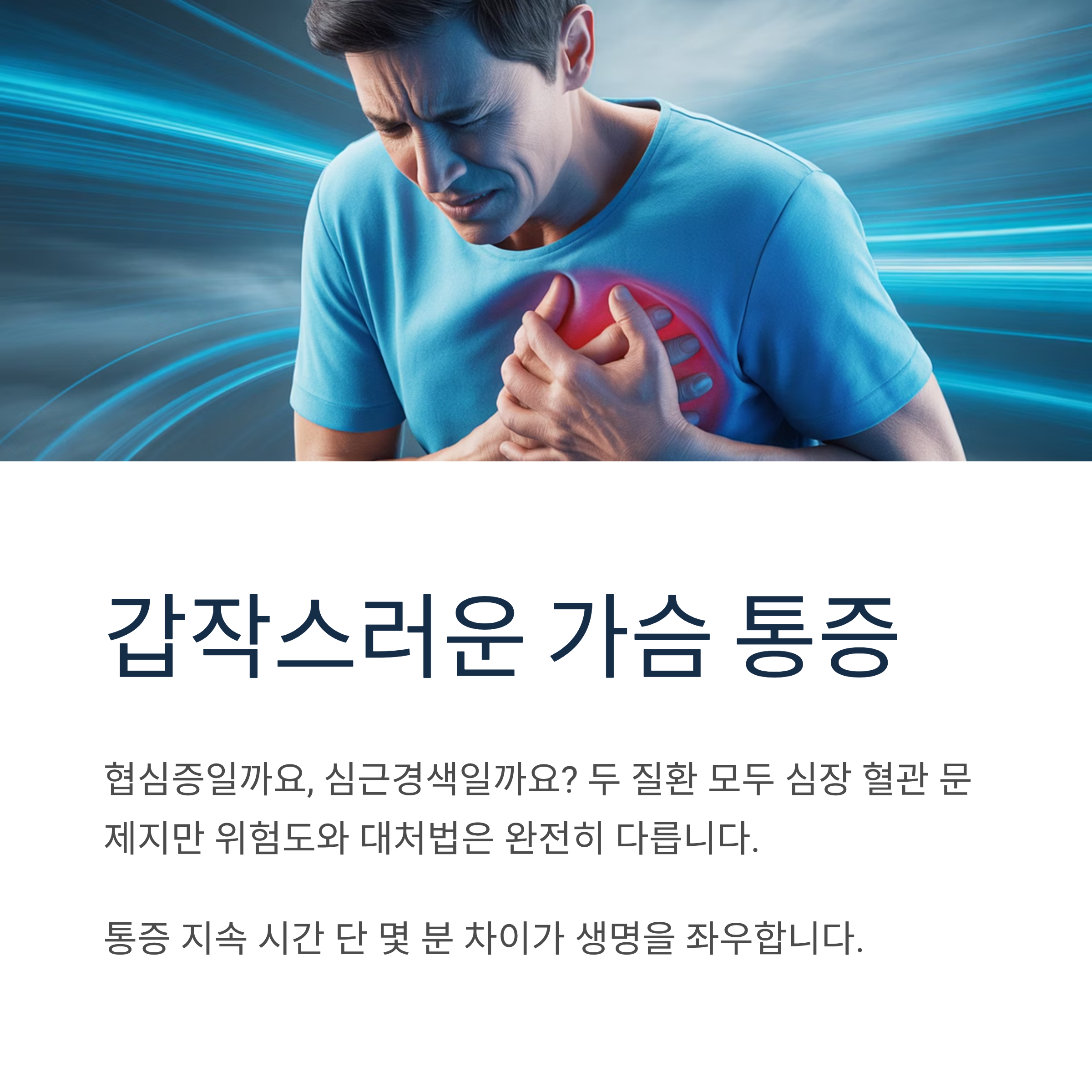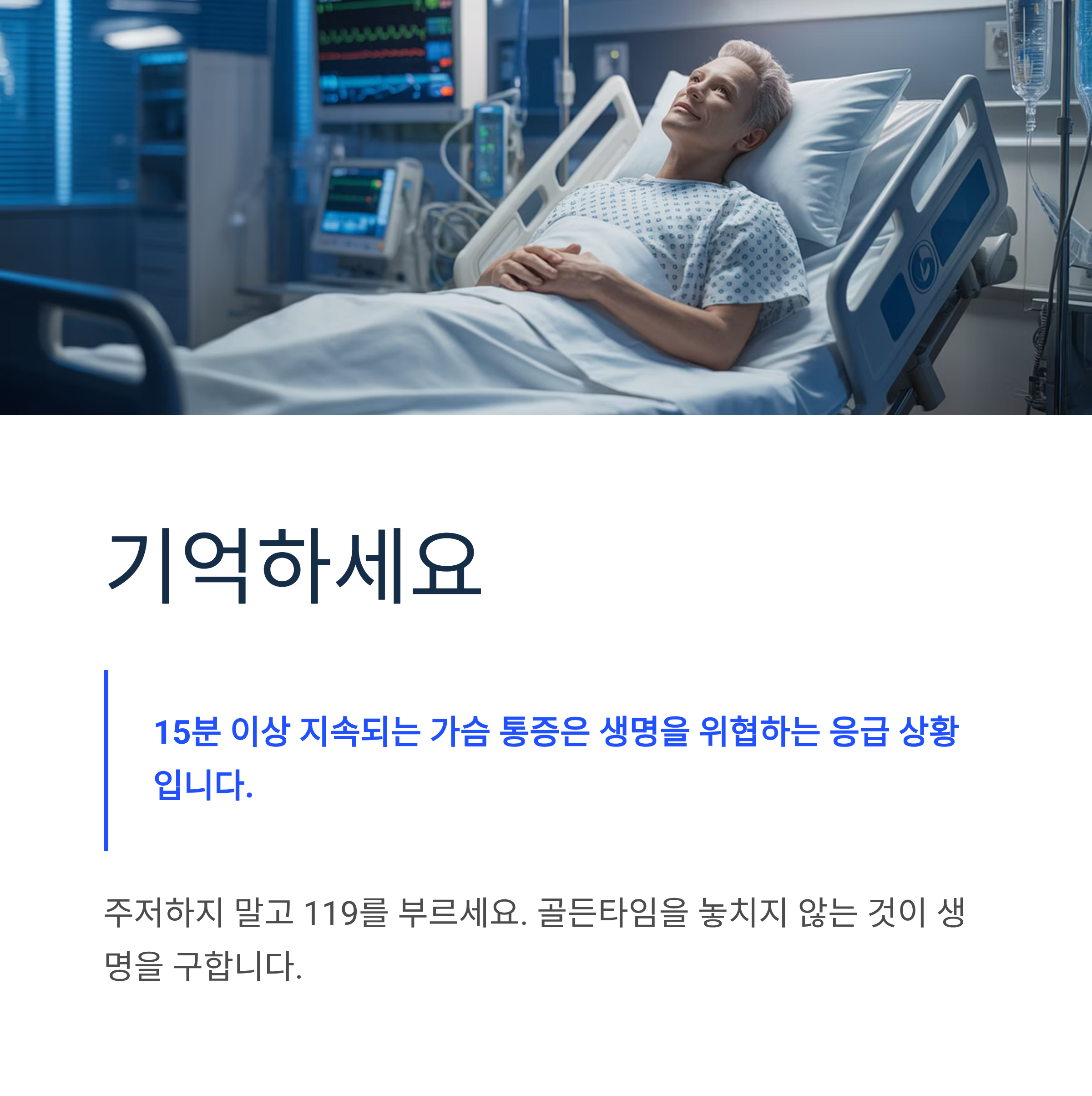 기억하세요: 15분 이상 지속되는 가슴 통증은 생명을 위협하는 응급 상황입니다. 주저하지 말고 119를 부르세요. 골든타임을 놓치지 않는 것이 생명을 구합니다.