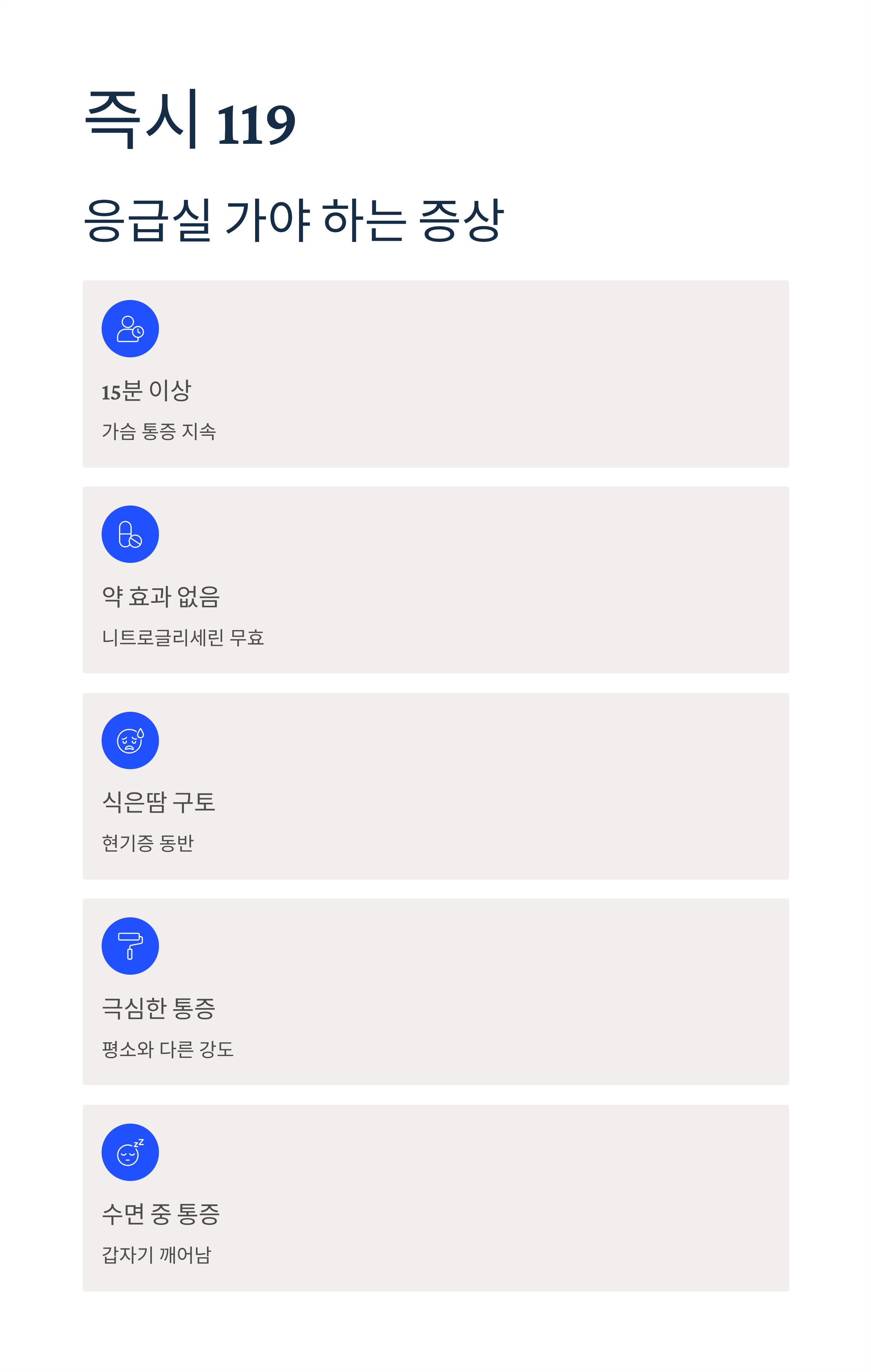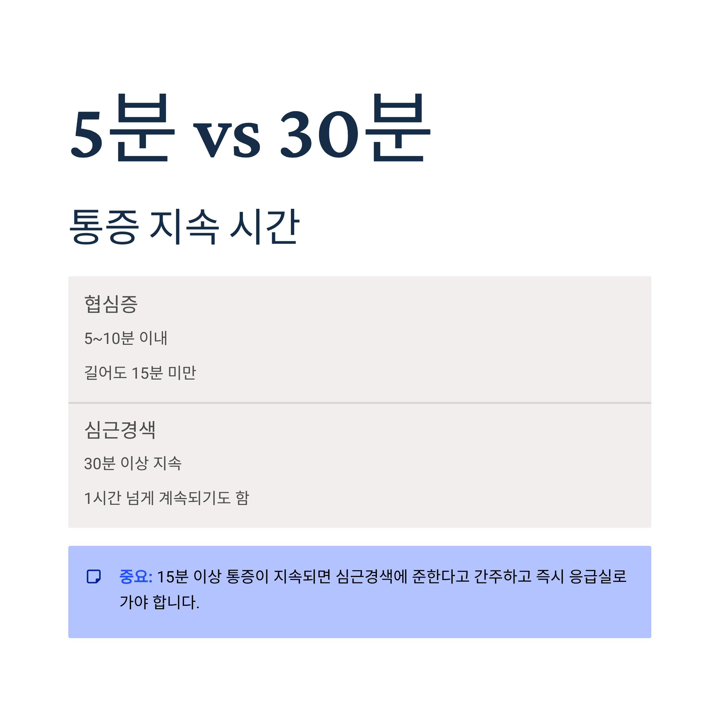 ⚠️ 중요: 15분 이상 협심증 급의 통증이 지속되면 심근경색에 준한다고 간주하고 즉시 응급실로 가야 합니다.