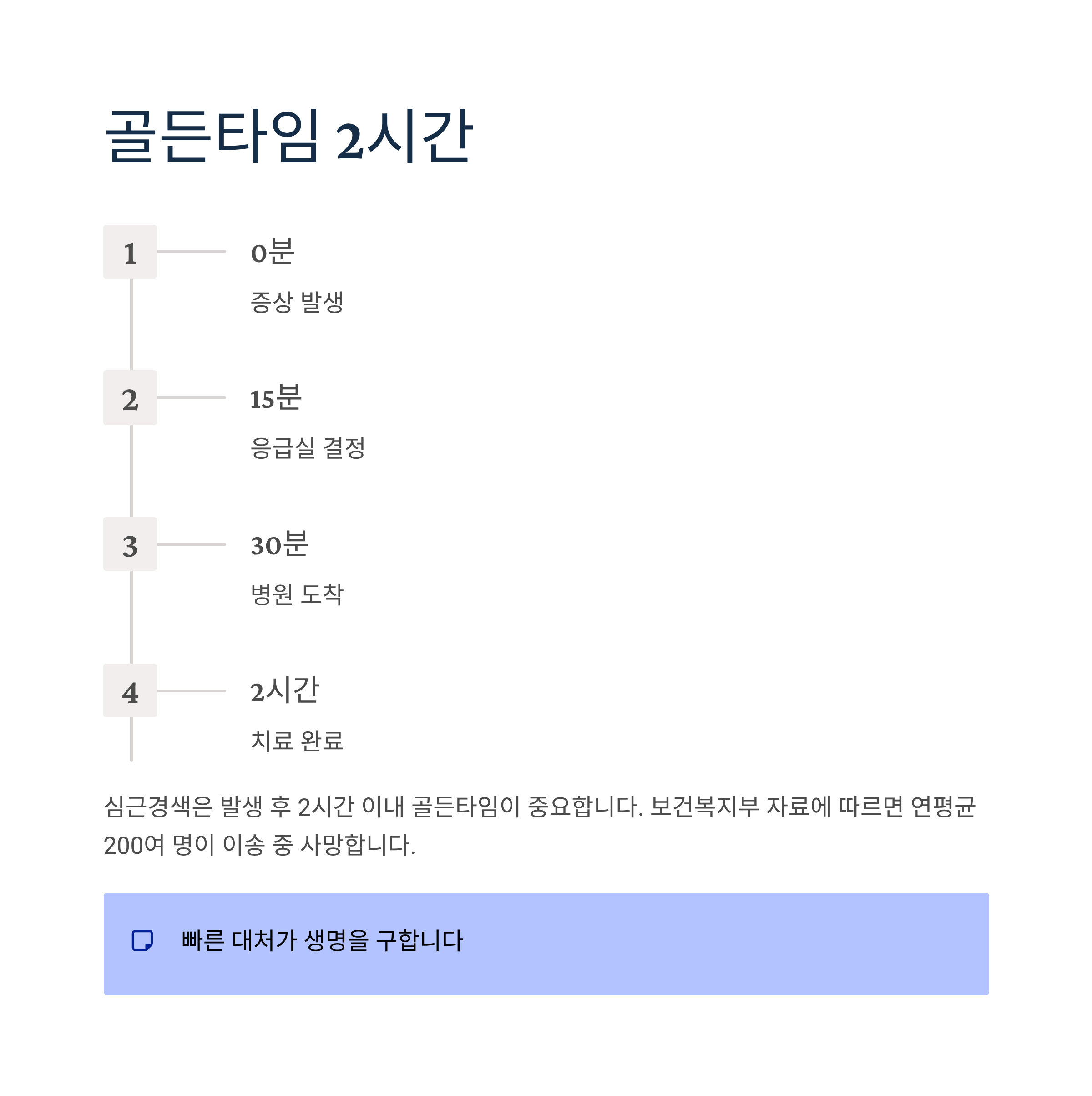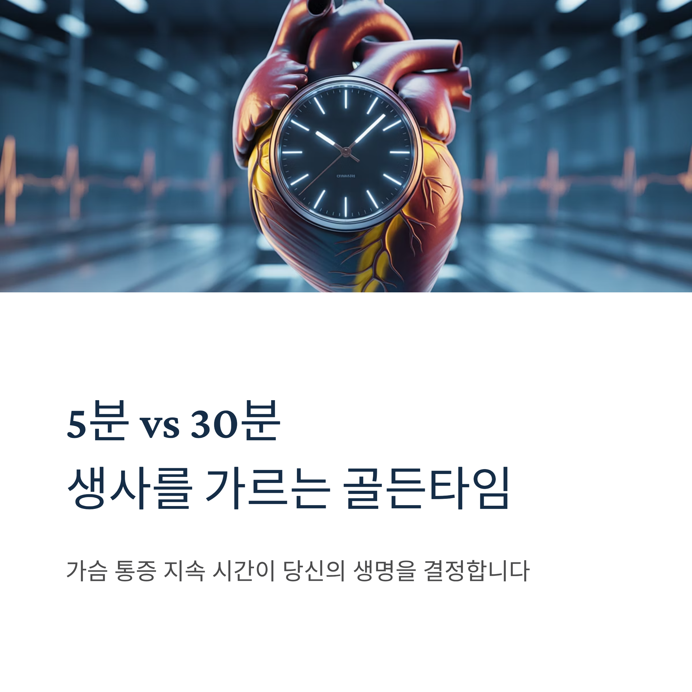 💔 심근경색은 발생 후 2시간 이내 골든타임이 중요합니다. 보건복지부 자료에 따르면 심근경색으로 병원 이송 중 연평균 200여 명이 사망합니다. 빠른 대처가 생명을 구합니다.