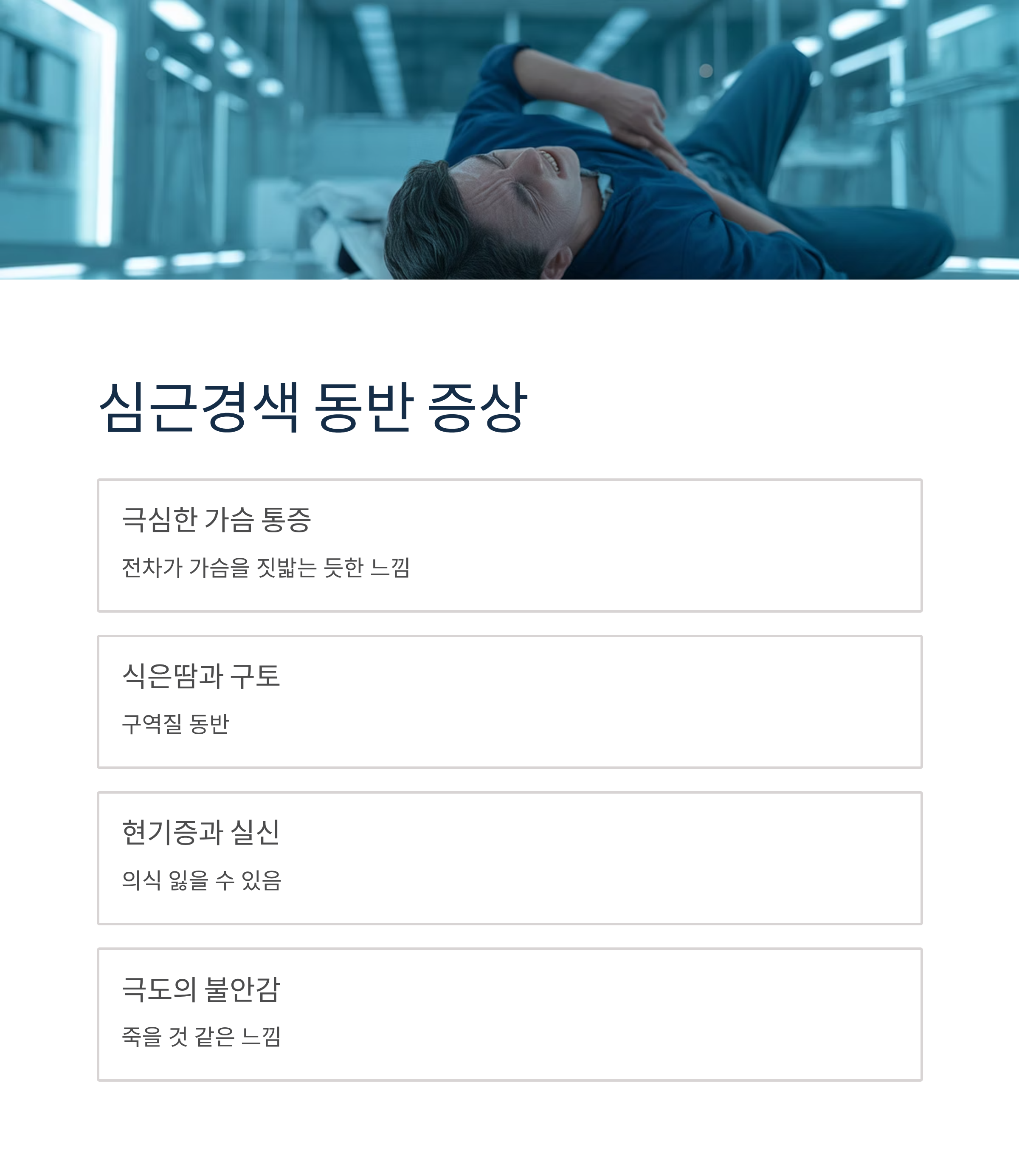 - 심근경색: 휴식을 취해도 통증이 사라지지 않음. 약도 효과 없음