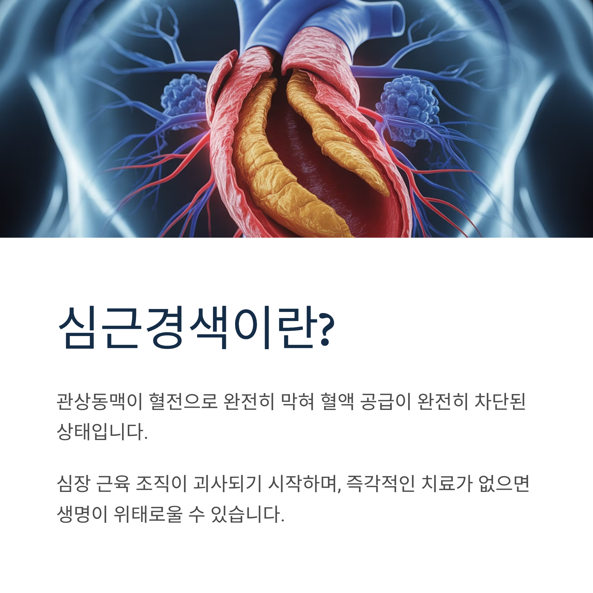 관상동맥이 혈전으로 완전히 막혀 혈액 공급이 완전히 차단된 상태입니다. 심장 근육 조직이 괴사되기 시작하며, 즉각적인 치료가 없으면 생명이 위태로울 수 있습니다.