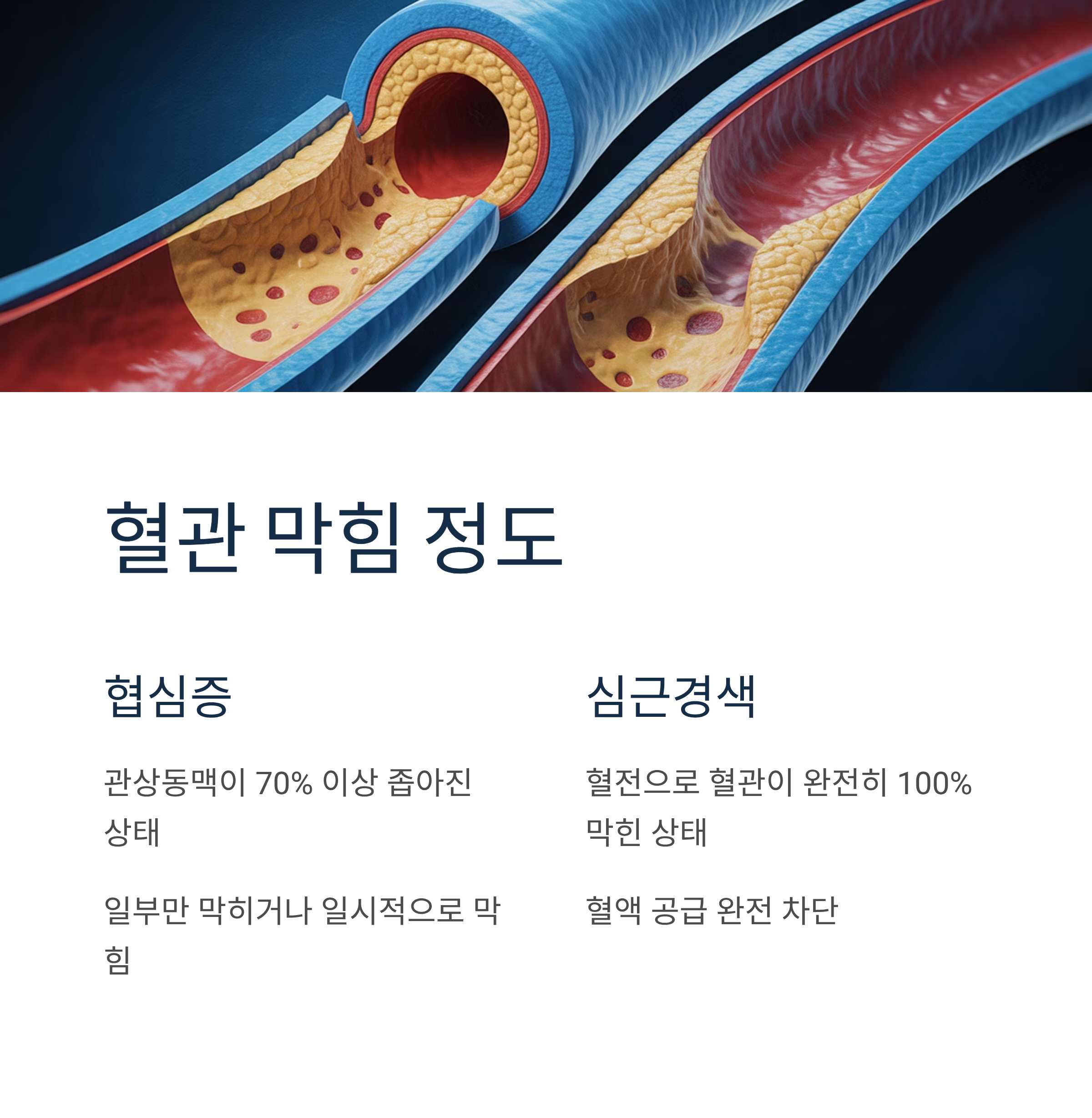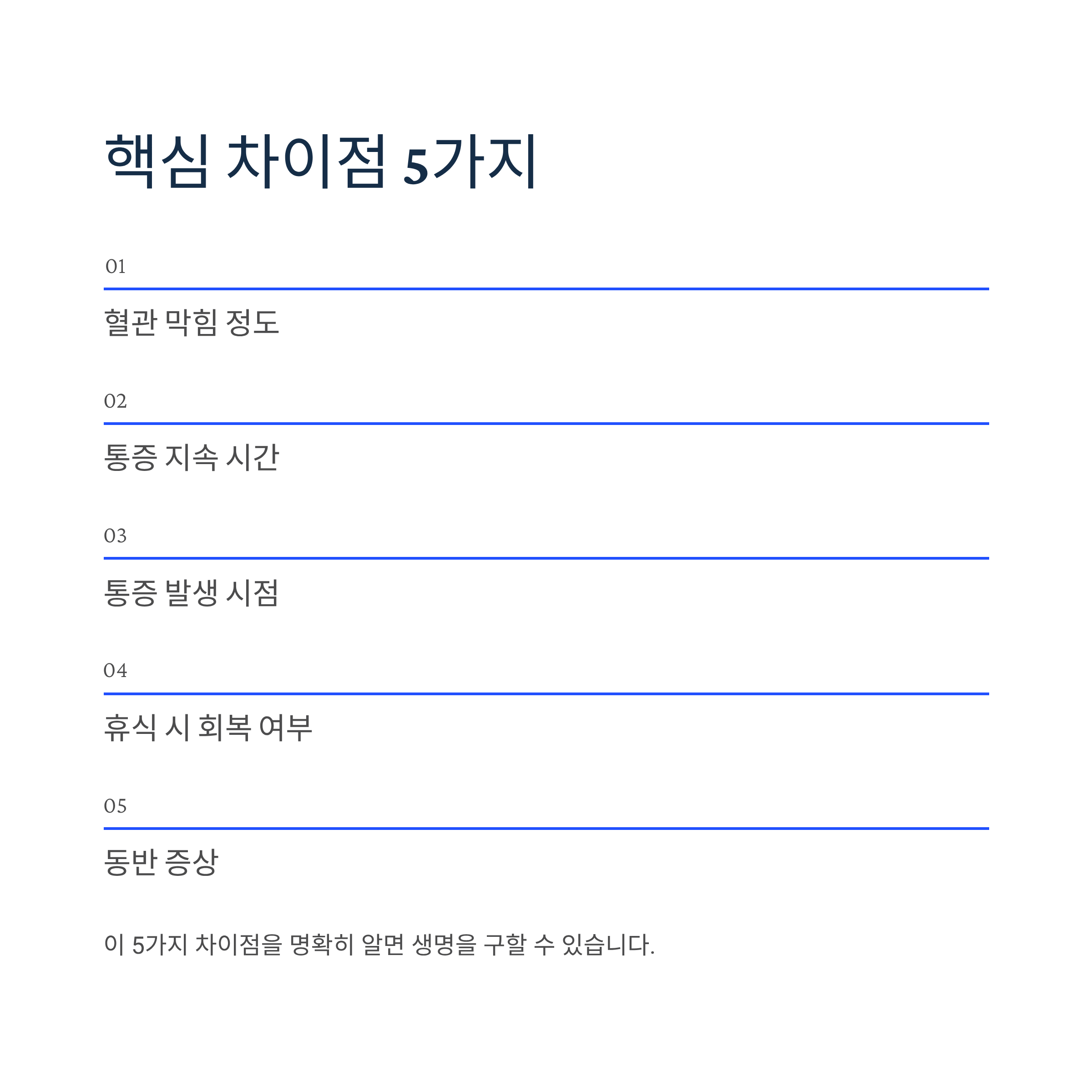 협심증과 심근경색은 모두 관상동맥 질환이지만, 통증 지속 시간이 가장 큰 구별 포인트입니다. 5~10분 내 사라지면 협심증, 30분 이상 지속되면 심근경색일 가능성이 높습니다.