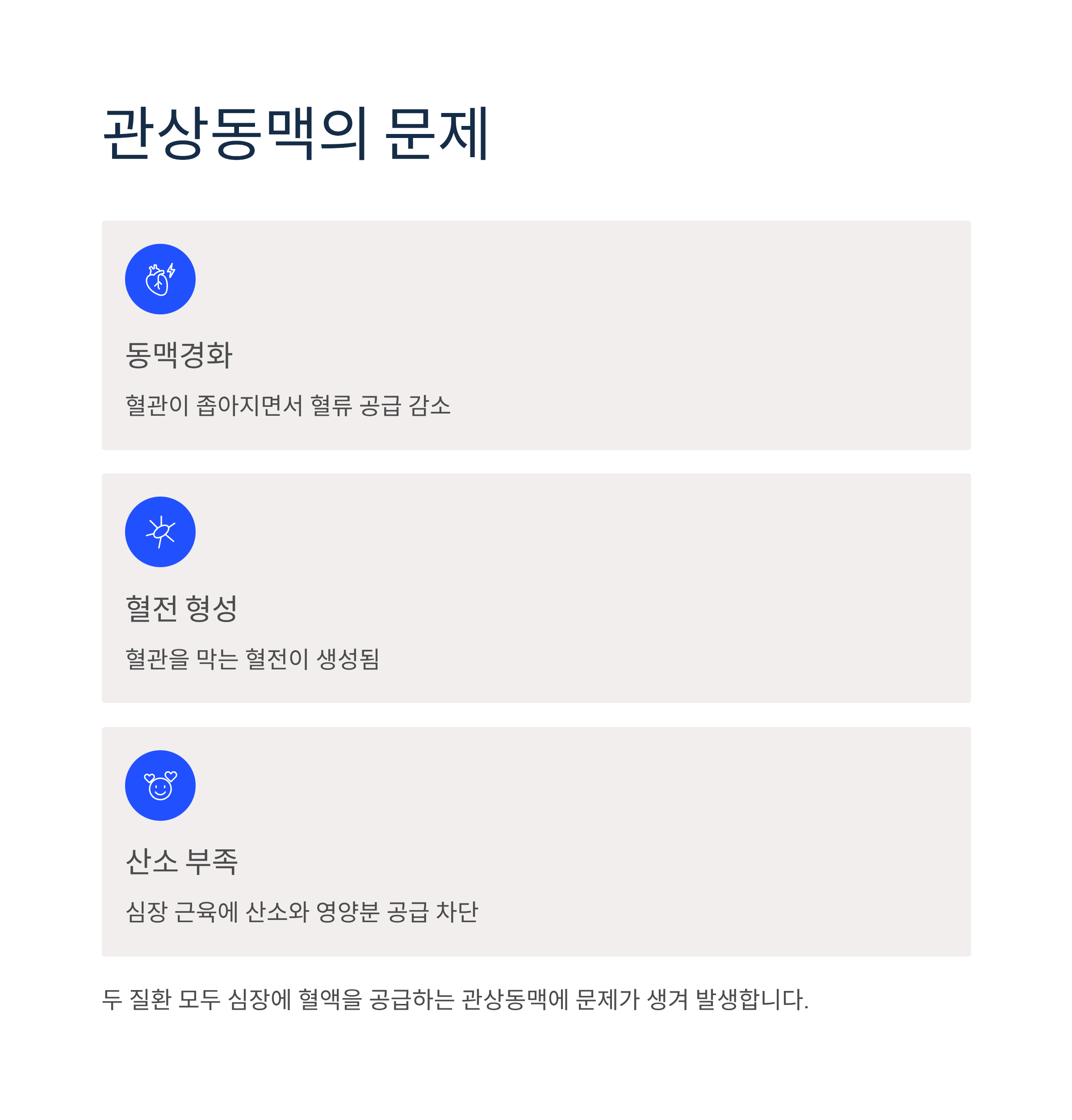 두 질환 모두 심장에 혈액을 공급하는 관상동맥에 문제가 생겨 발생합니다. 동맥경화로 혈관이 좁아지거나 혈전이 생기면서 심장 근육에 충분한 산소와 영양분이 공급되지 못하는 것이죠.