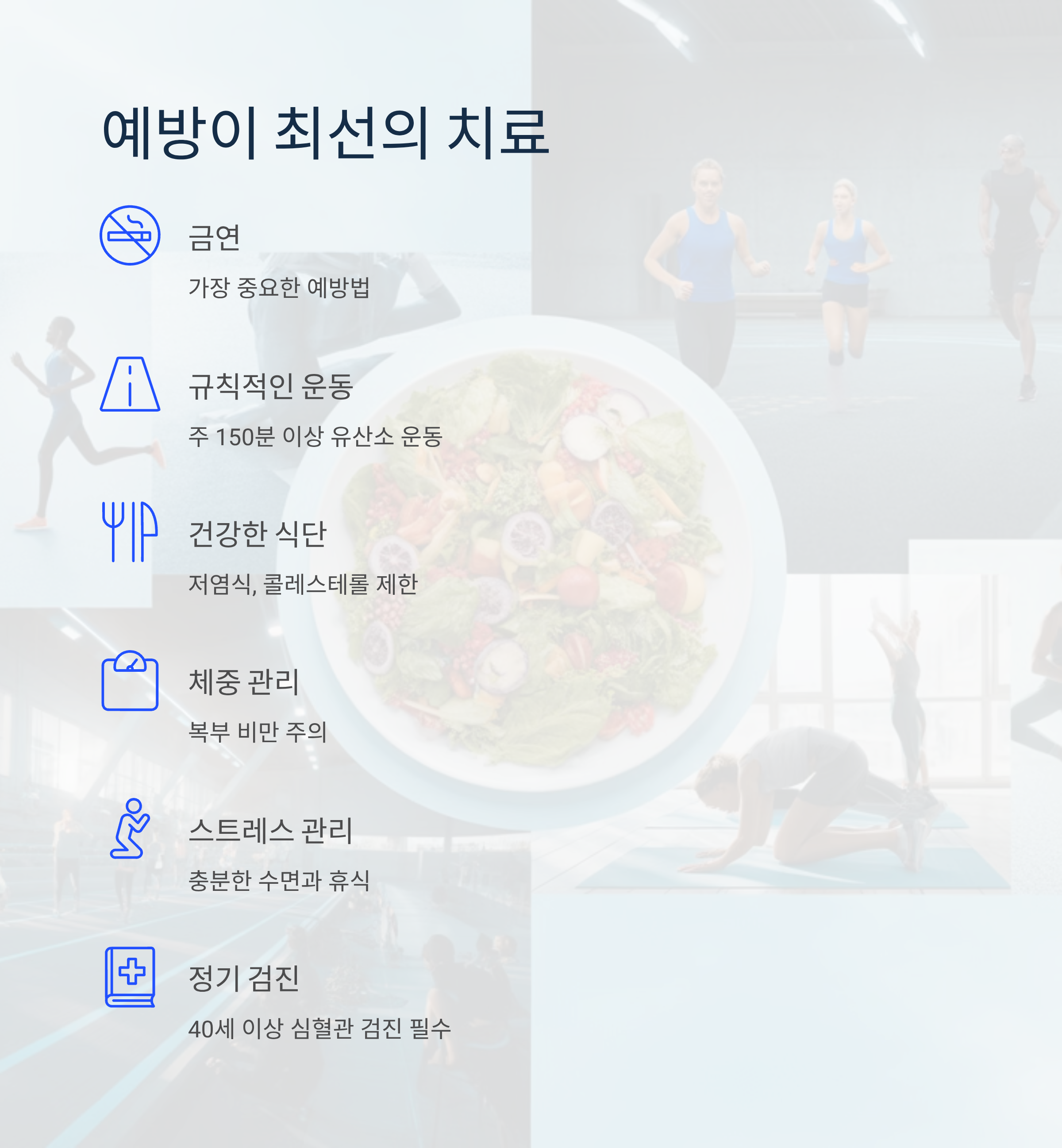 - 정기 검진: 40세 이상은 심혈관 검진 필수