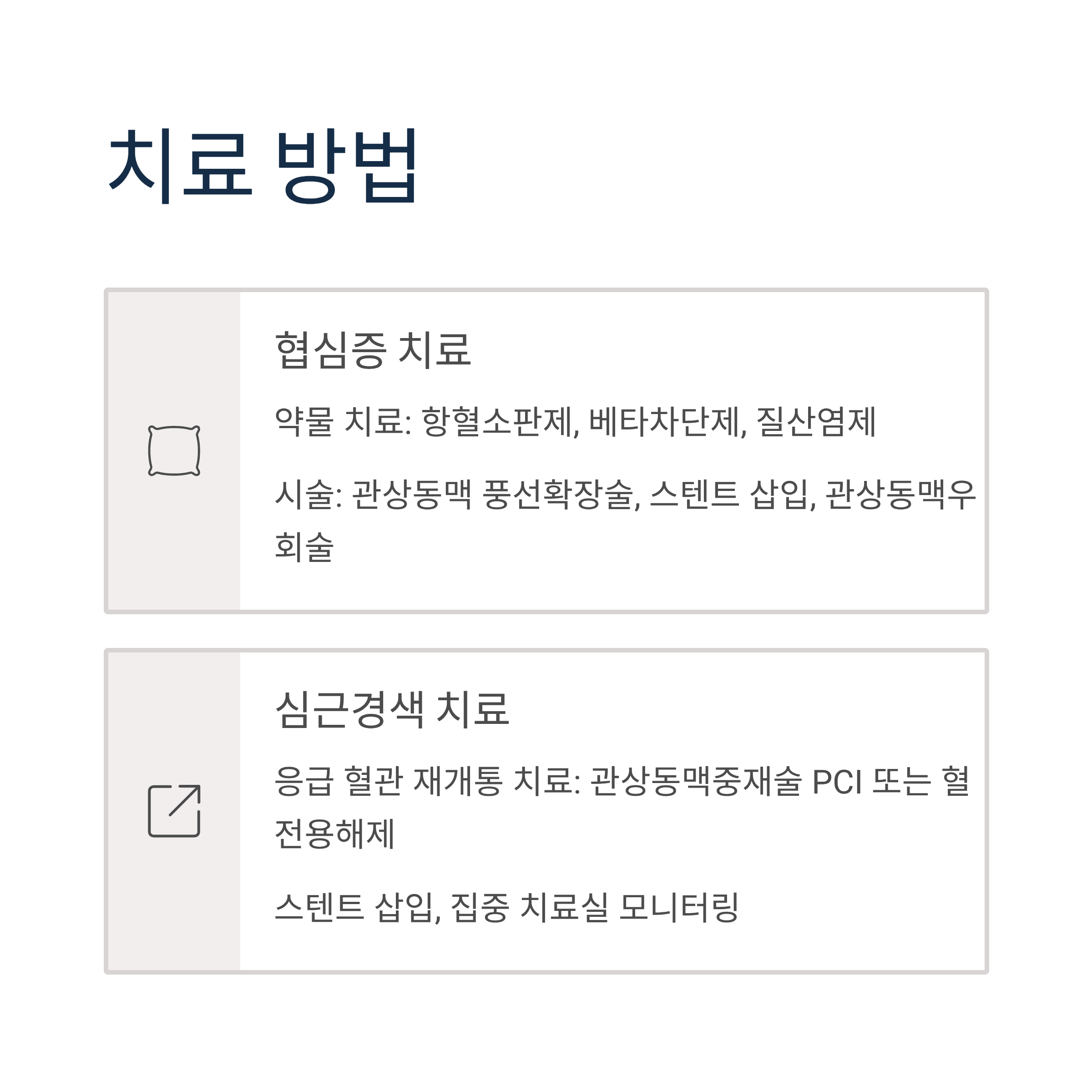 협심증: 약물 치료(항혈소판제, 베타차단제, 질산염제), 관상동맥 풍선확장술, 스텐트 삽입, 관상동맥우회술