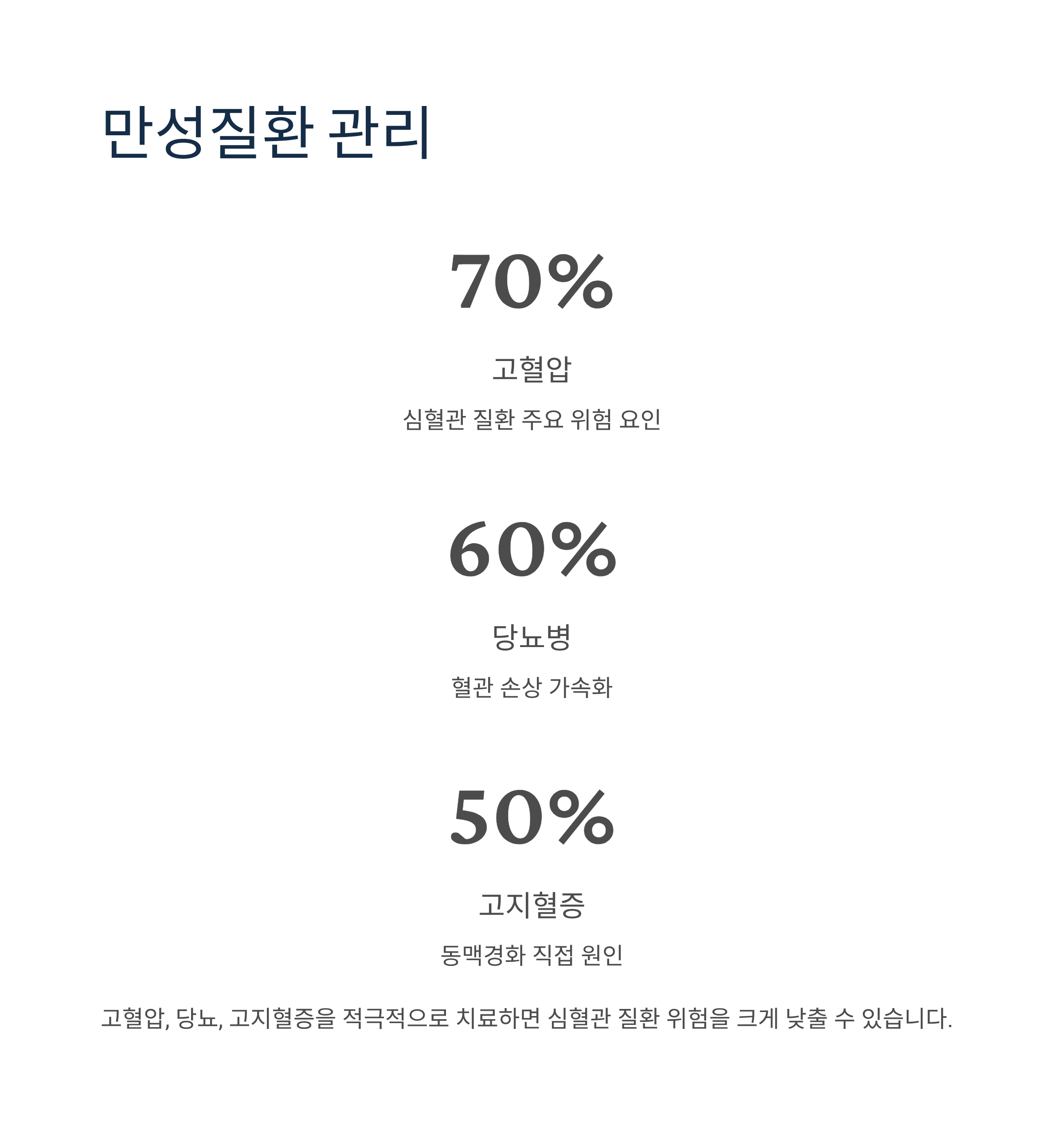 - 만성질환 관리: 고혈압, 당뇨, 고지혈증 적극 치료