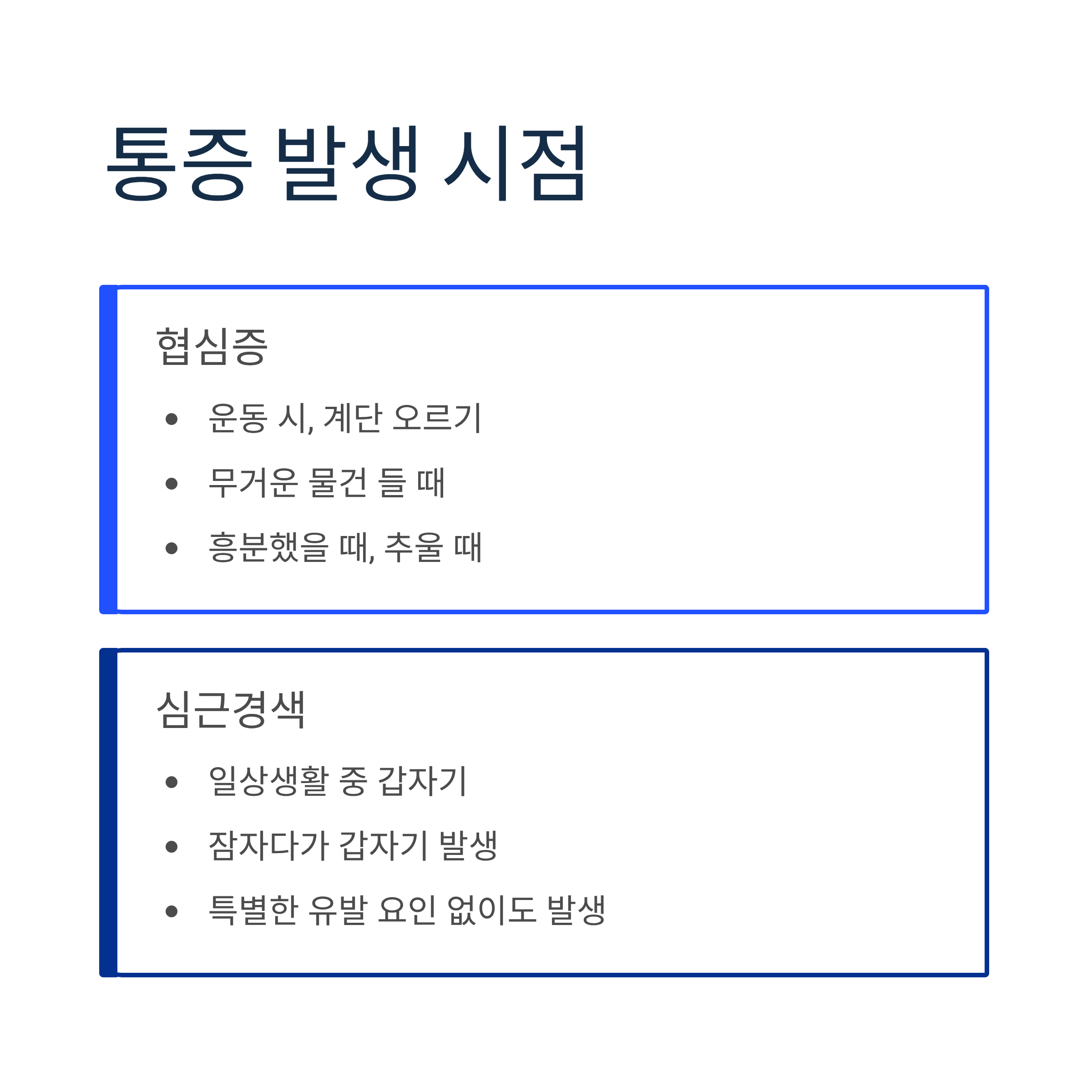 - 협심증: 주로 운동 시, 계단 오르기, 무거운 물건 들 때, 흥분했을 때, 추울 때 발생