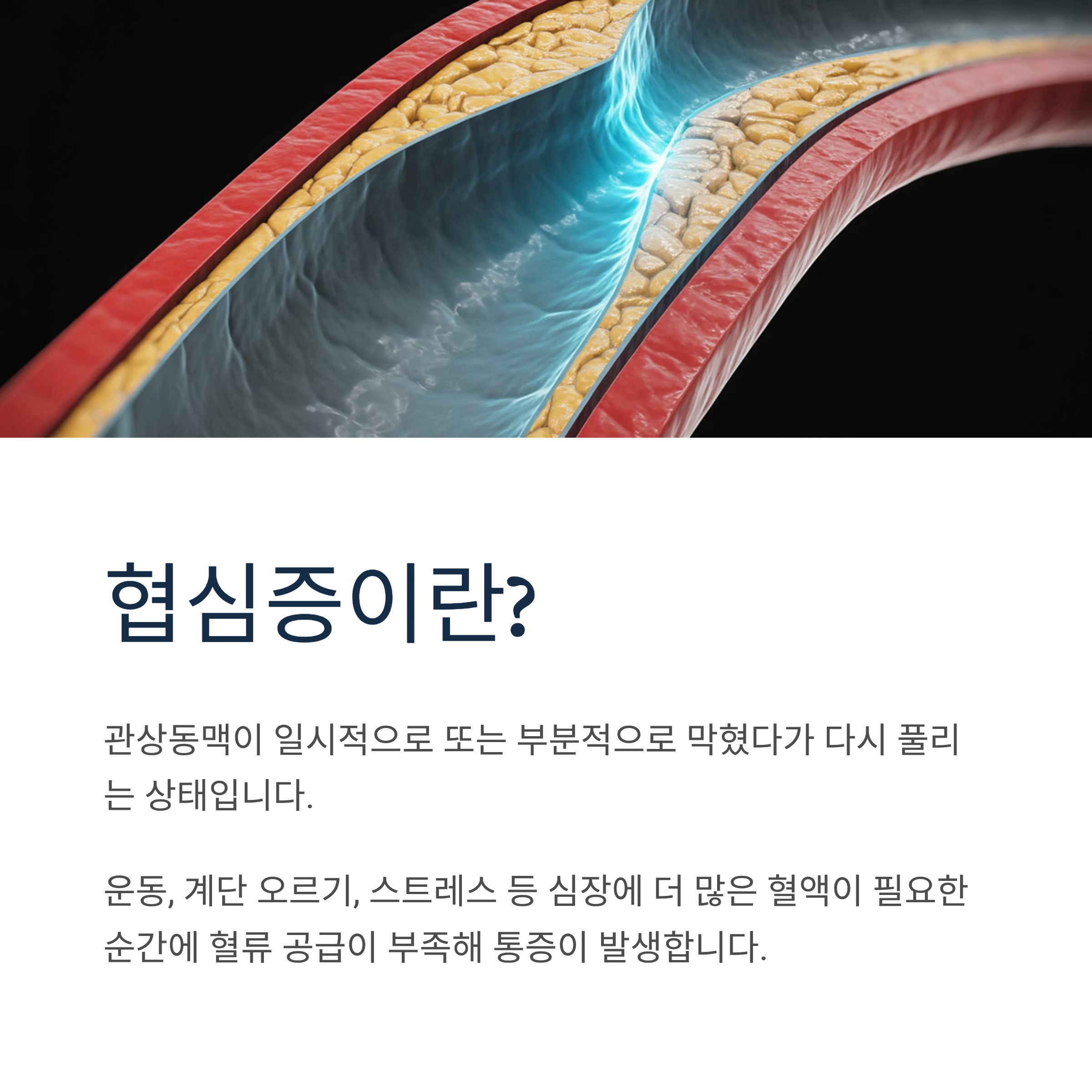 관상동맥이 일시적으로 또는 부분적으로 막혔다가 다시 풀리는 상태입니다. 심장에 더 많은 혈액이 필요한 순간(운동, 계단 오르기, 스트레스 등)에 혈류 공급이 부족해 통증이 발생합니다.