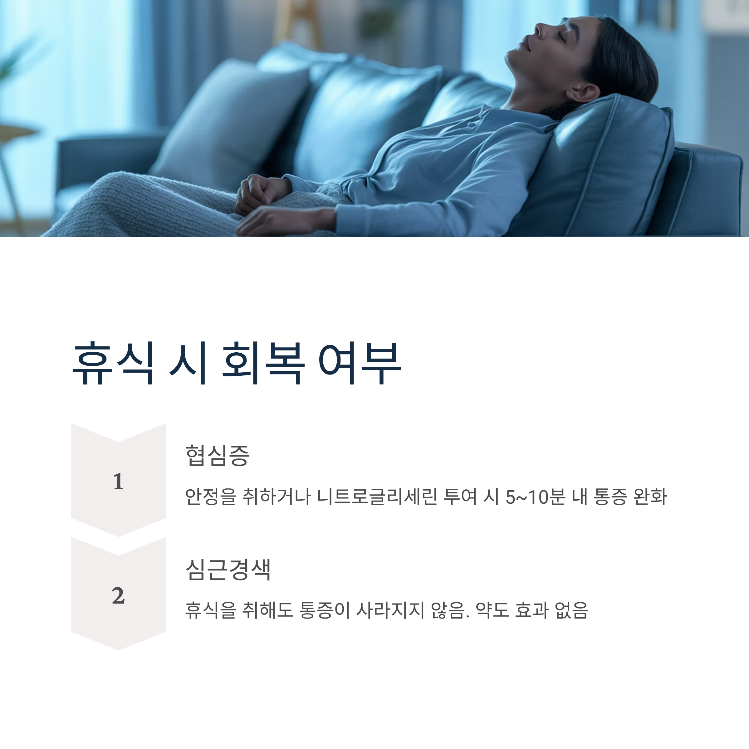 - 협심증: 안정을 취하거나 니트로글리세린 혀 밑 투여 시 5~10분 내 통증 완화