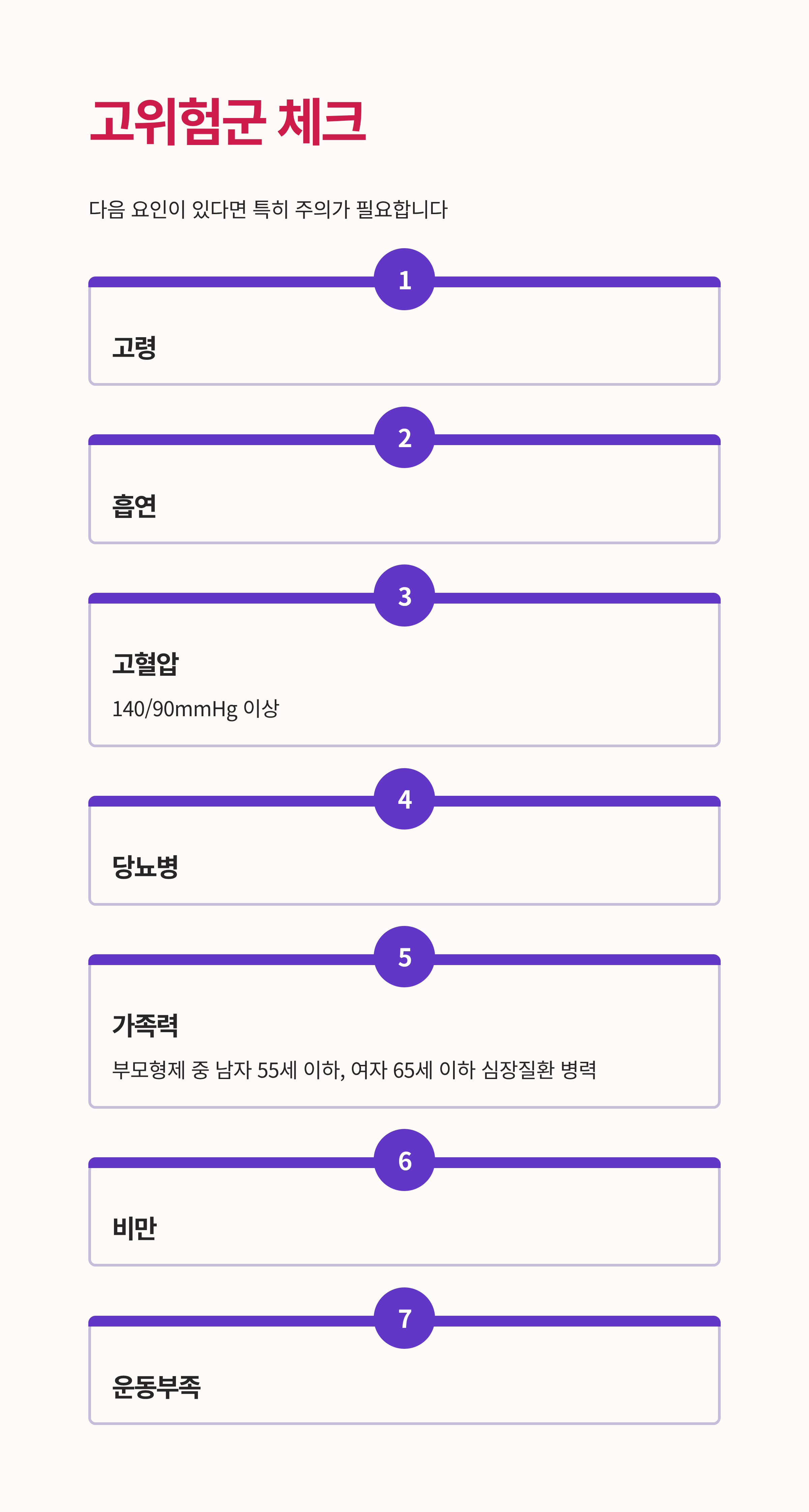 - 가족력 (부모형제 중 남자 55세 이하, 여자 65세 이하에서 허혈성 심장질환 병력)
