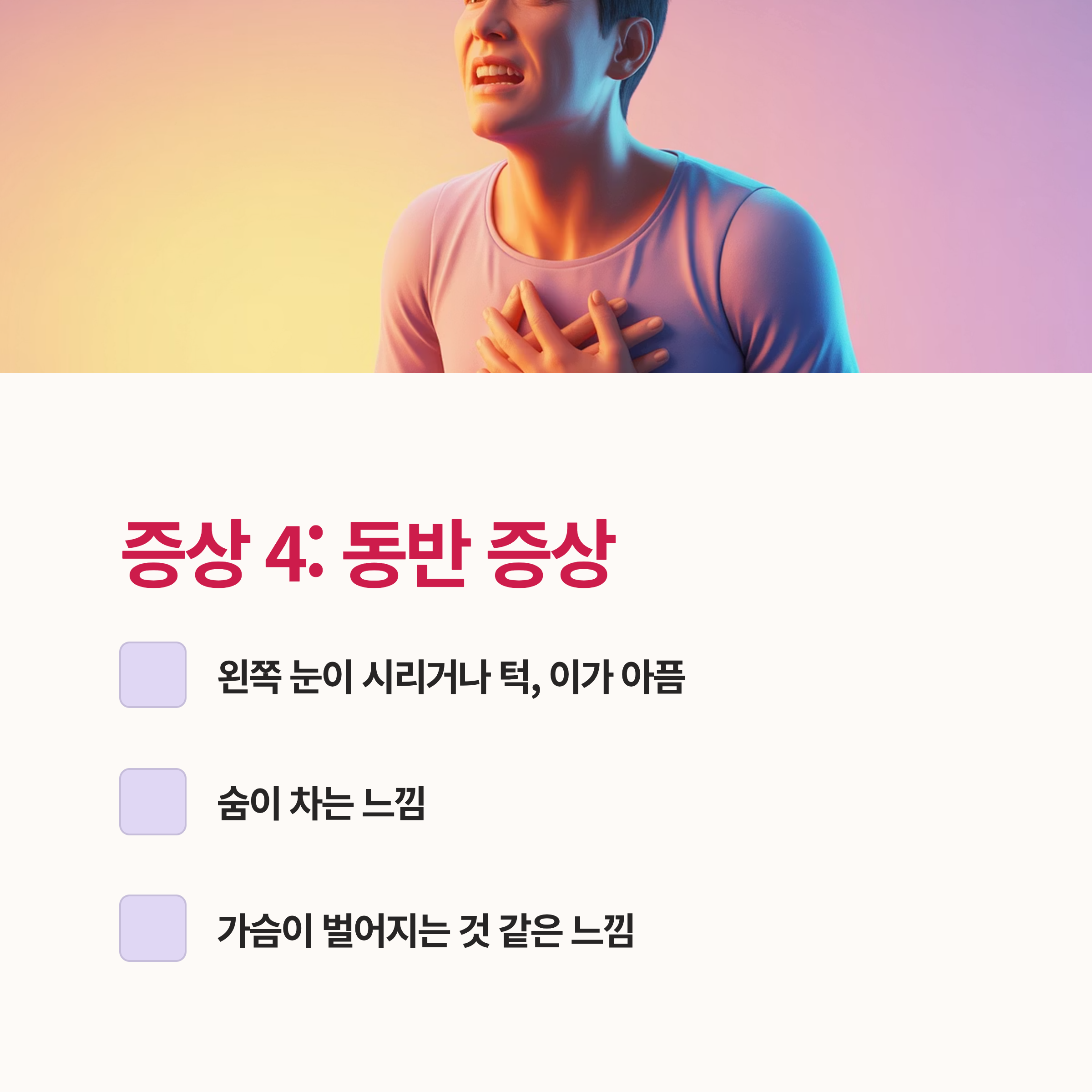 왼쪽 눈이 시리거나 턱이나 이가 아픈 증상이 동반되기도 합니다. 환자에 따라 '숨이 차다', '가슴이 벌어지는 것 같다'고 표현하기도 합니다.